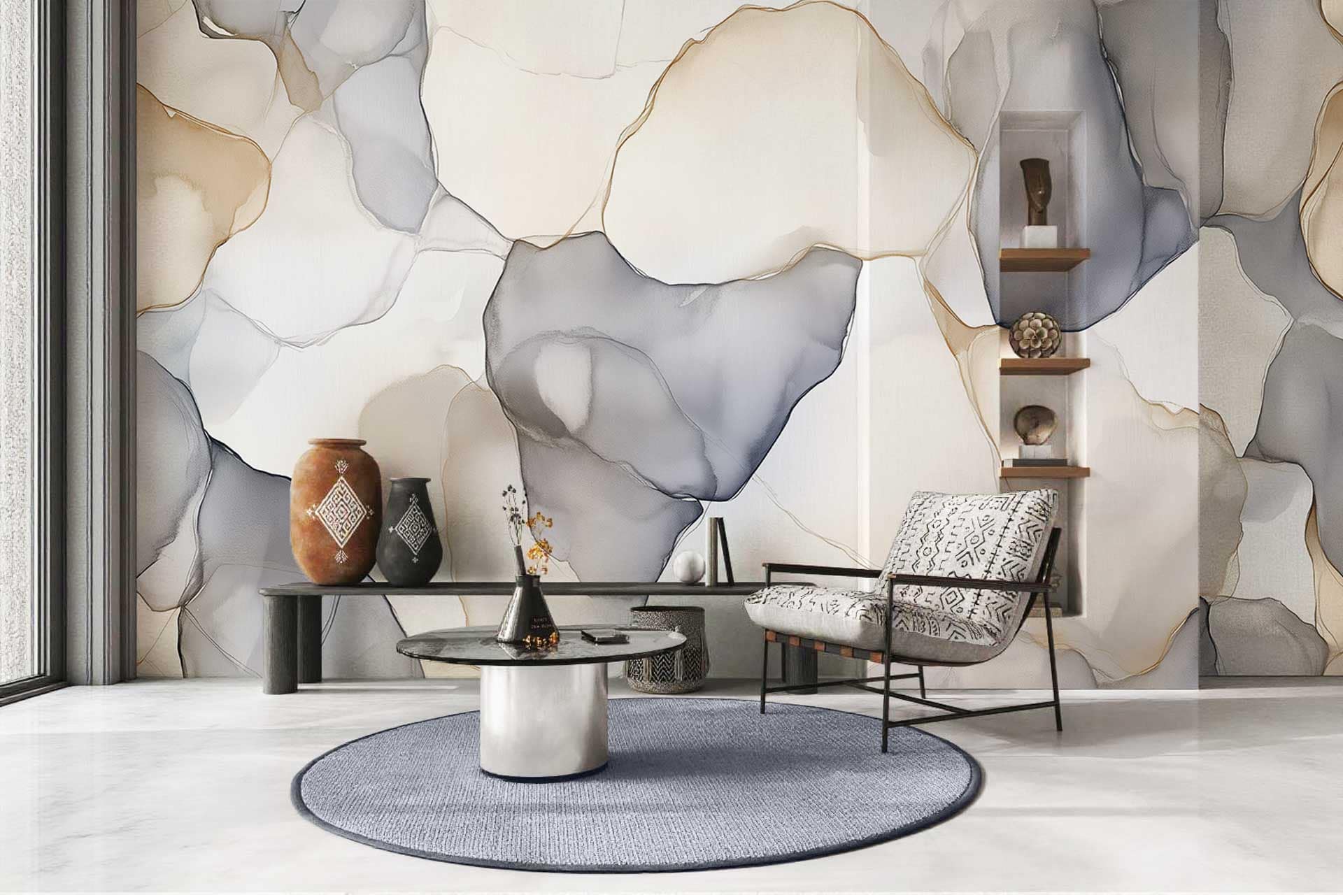 Wallpaper visualizer showcases a wallpaper design with distinct elements and colors, making patterns and shades easily searchable. The focus is on the wallpaper's features as displayed within the minimalist interface.