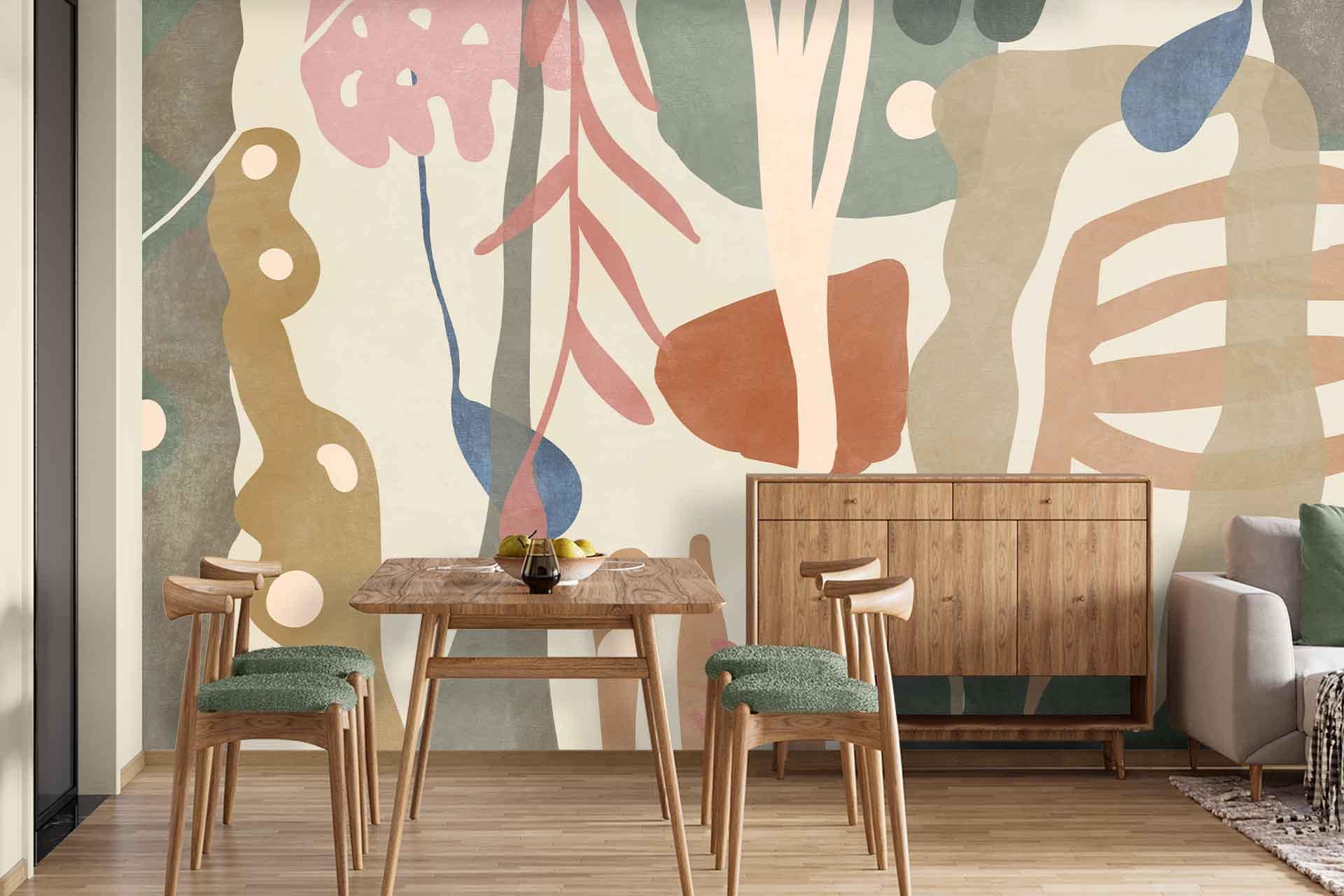Vibrant floral and bird wallpaper featuring colorful flowers and birds in lively patterns, with bold hues of pink, green, blue, and yellow creating a dynamic focal point in the room.