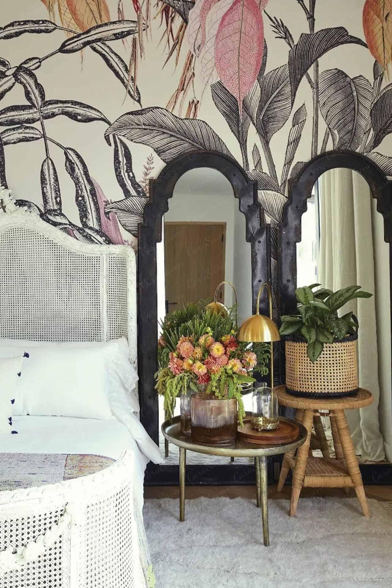 The bathroom features decorative wallpaper with bold, colorful floral patterns in shades of pink, green, and white. The distinctive wallpaper adds a vibrant backdrop behind the vanity and mirrors, easily highlighting its eye-catching design for search.