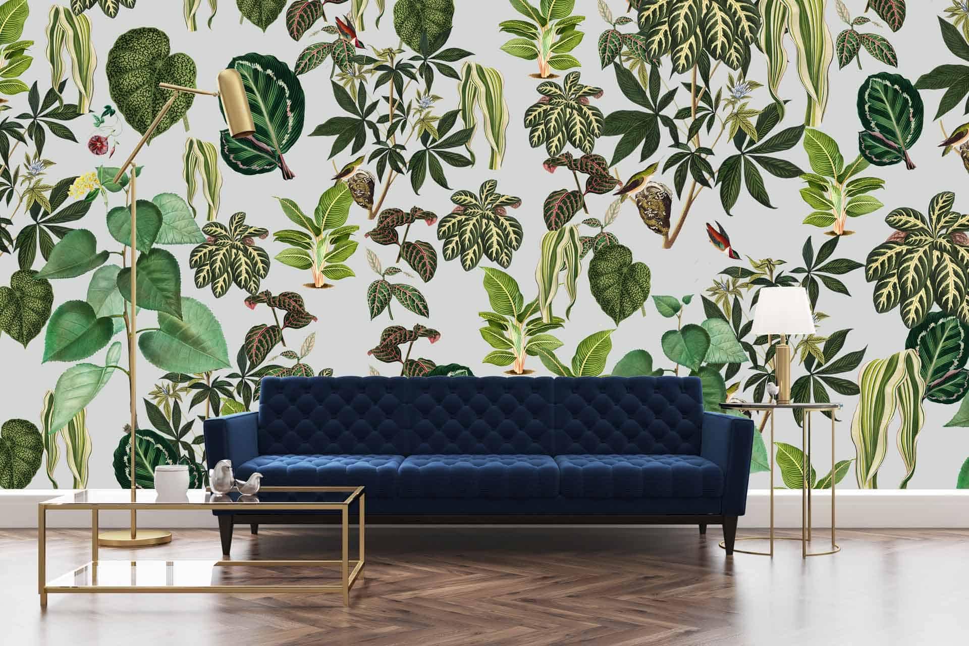 Vibrant floral and bird wallpaper featuring colorful flowers and birds in lively patterns, with bold hues of pink, green, blue, and yellow creating a dynamic focal point in the room.