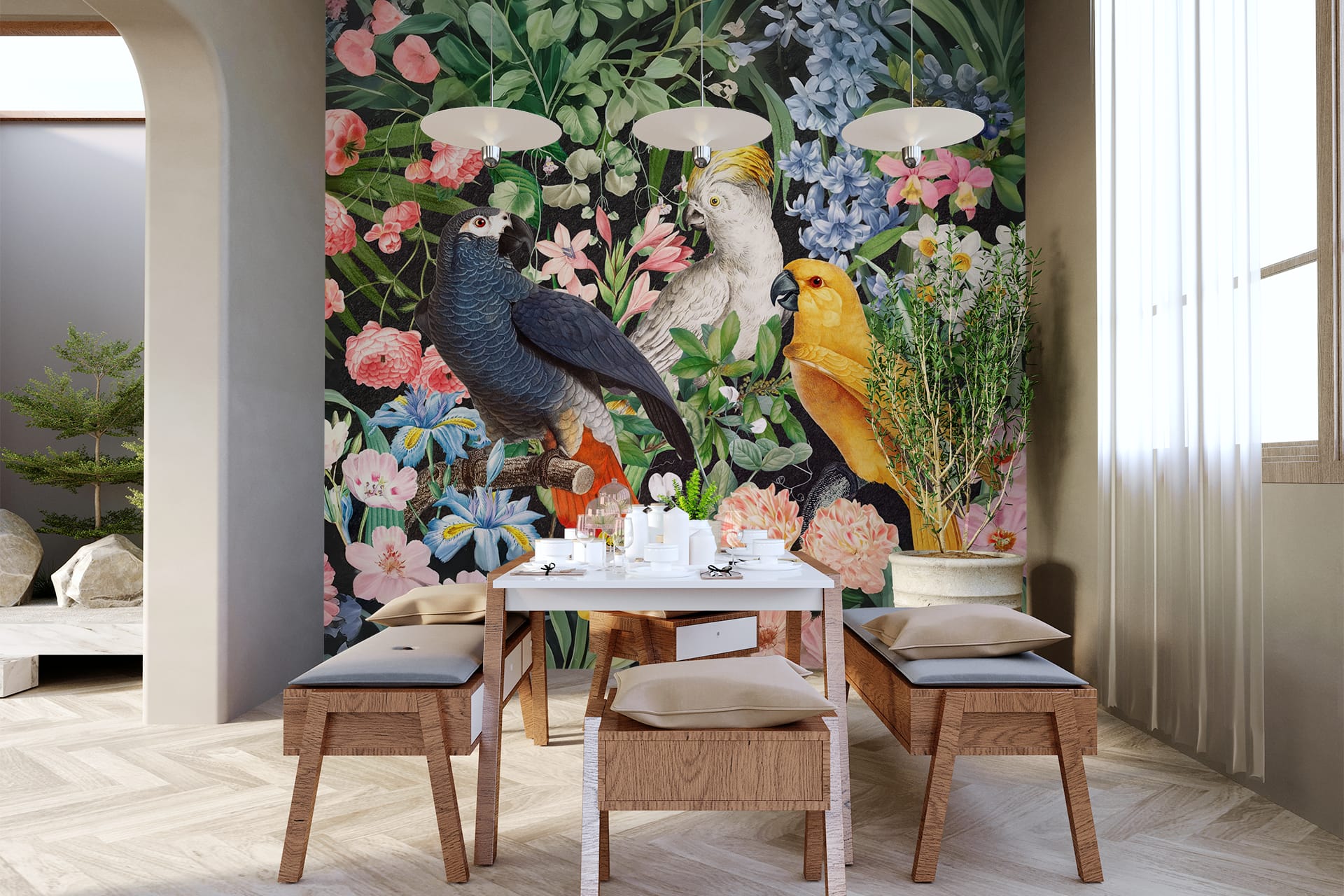 Vibrant floral and bird wallpaper featuring colorful flowers and birds in lively patterns, with bold hues of pink, green, blue, and yellow creating a dynamic focal point in the room.