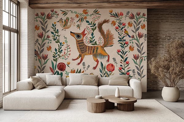 Vibrant floral and bird wallpaper featuring colorful flowers and birds in lively patterns, with bold hues of pink, green, blue, and yellow creating a dynamic focal point in the room.