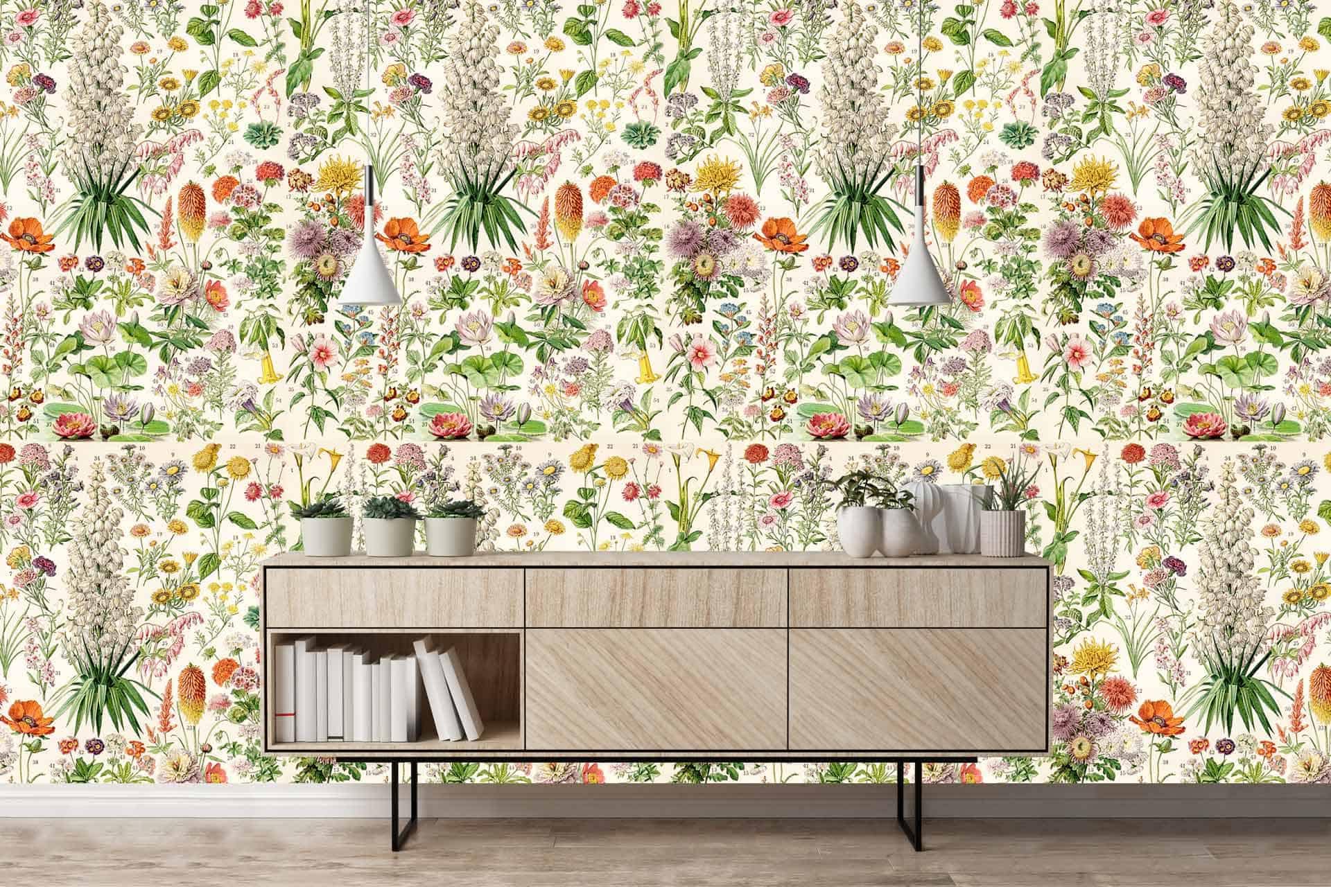 Vibrant floral and bird wallpaper featuring colorful flowers and birds in lively patterns, with bold hues of pink, green, blue, and yellow creating a dynamic focal point in the room.