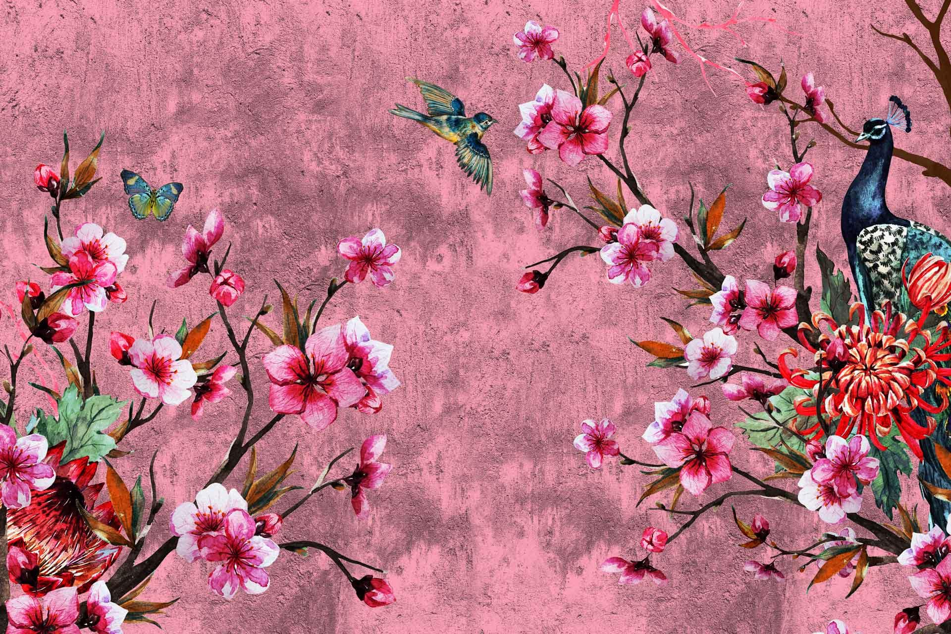 Vibrant floral and bird wallpaper featuring colorful flowers and birds in lively patterns, with bold hues of pink, green, blue, and yellow creating a dynamic focal point in the room.