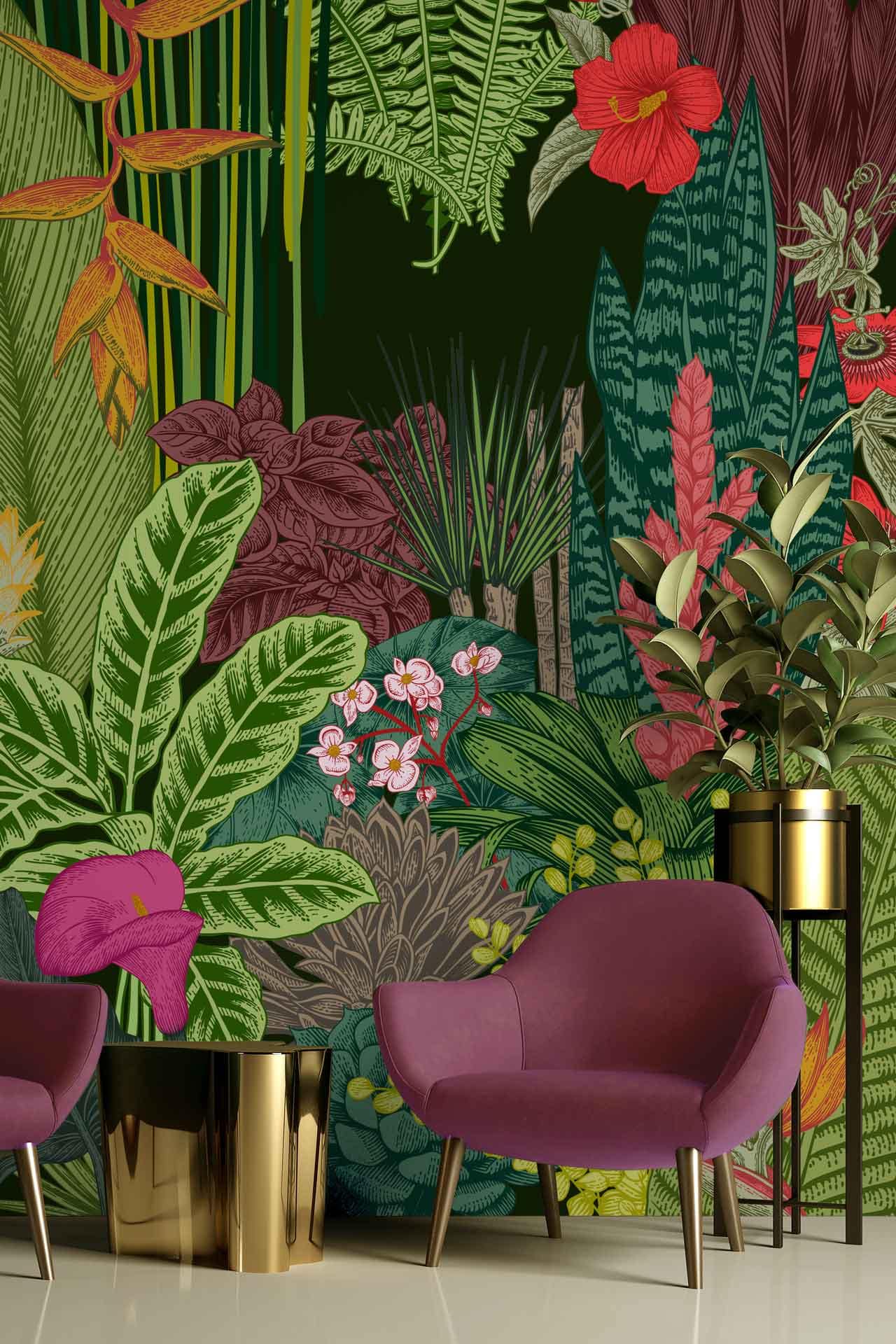 Vibrant floral and bird wallpaper featuring colorful flowers and birds in lively patterns, with bold hues of pink, green, blue, and yellow creating a dynamic focal point in the room.