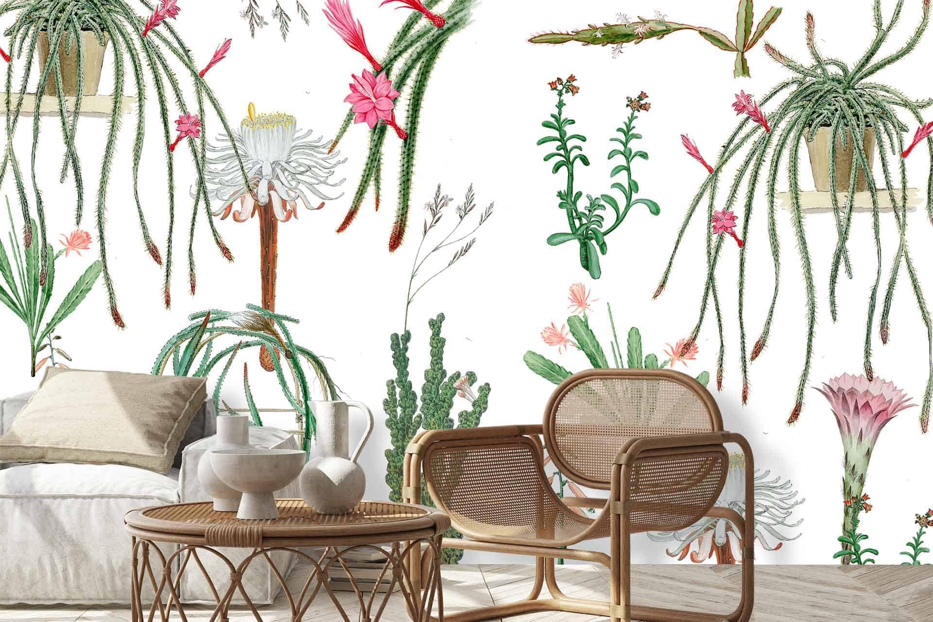 Vibrant floral and bird wallpaper featuring colorful flowers and birds in lively patterns, with bold hues of pink, green, blue, and yellow creating a dynamic focal point in the room.
