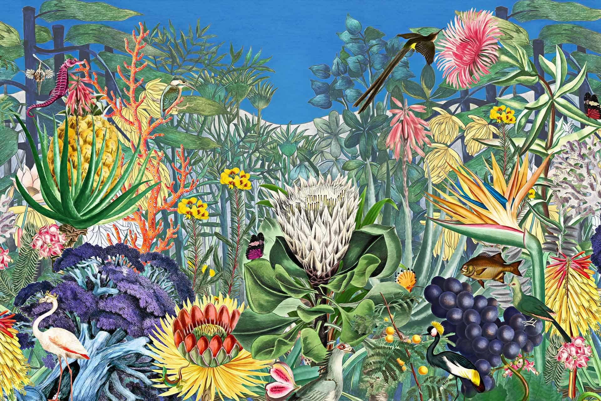 Vibrant floral and bird wallpaper featuring colorful flowers and birds in lively patterns, with bold hues of pink, green, blue, and yellow creating a dynamic focal point in the room.