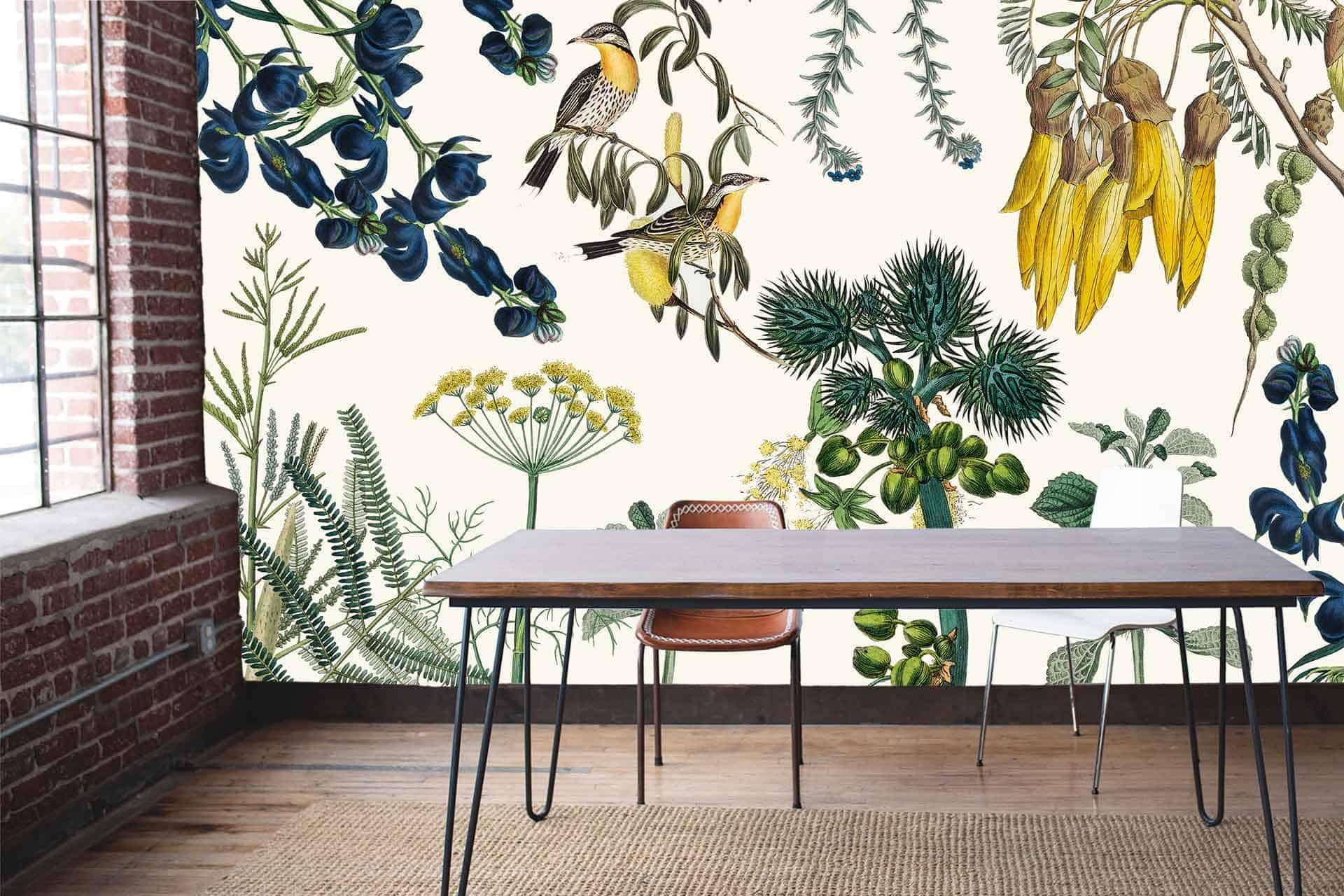 Vibrant floral and bird wallpaper featuring colorful flowers and birds in lively patterns, with bold hues of pink, green, blue, and yellow creating a dynamic focal point in the room.