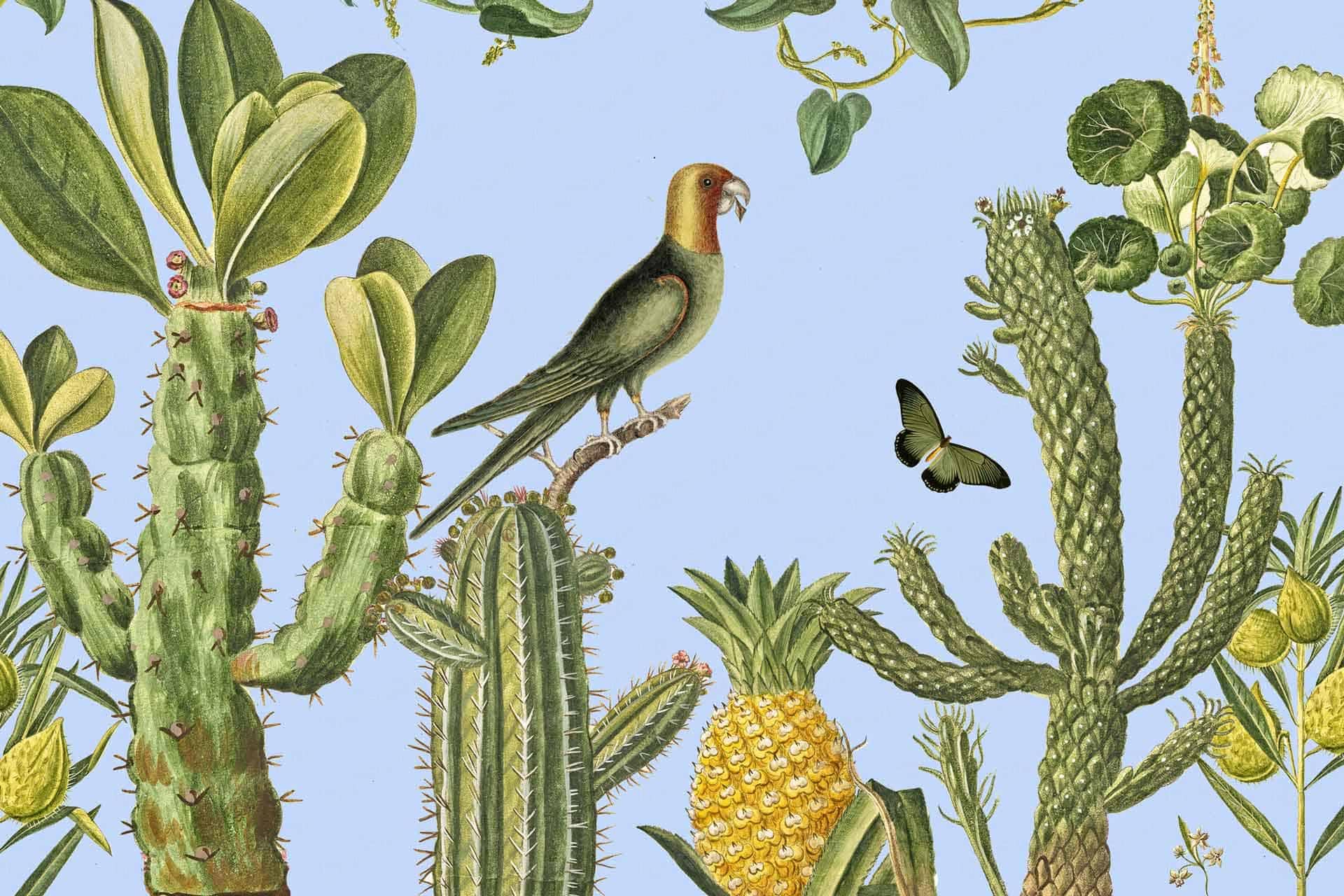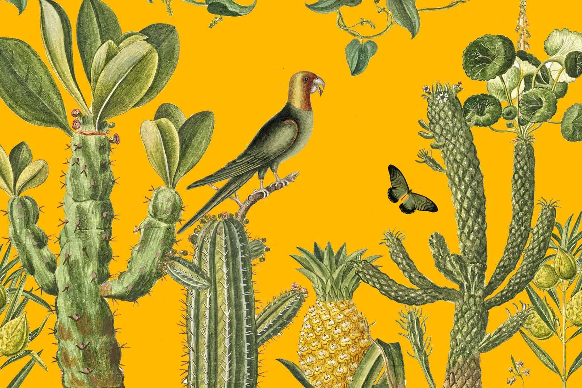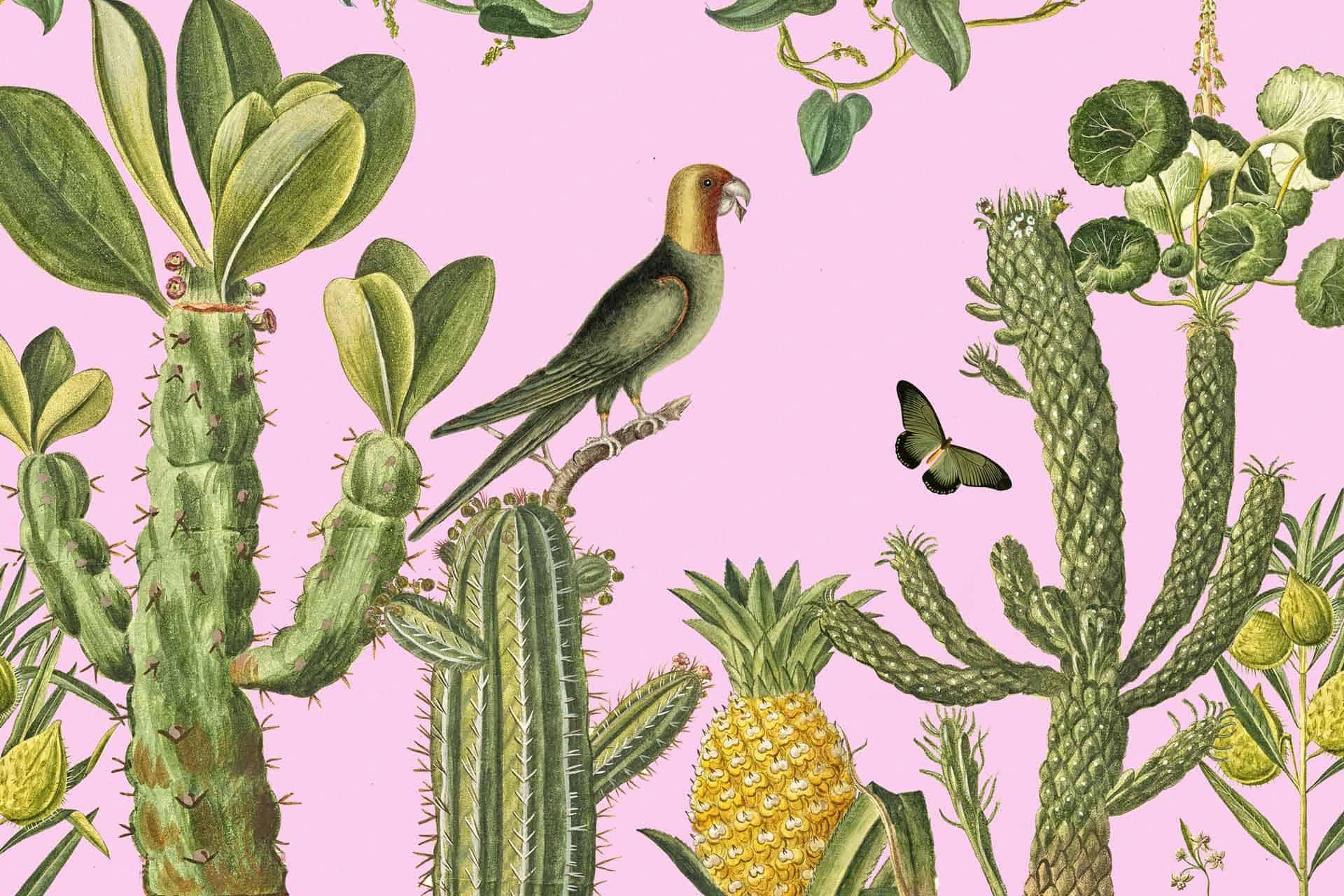 Vibrant floral and bird wallpaper featuring colorful flowers and birds in lively patterns, with bold hues of pink, green, blue, and yellow creating a dynamic focal point in the room.
