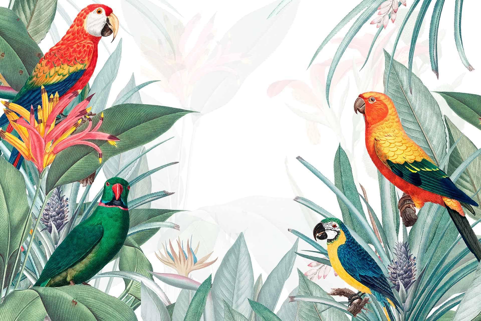 Vibrant floral and bird wallpaper featuring colorful flowers and birds in lively patterns, with bold hues of pink, green, blue, and yellow creating a dynamic focal point in the room.