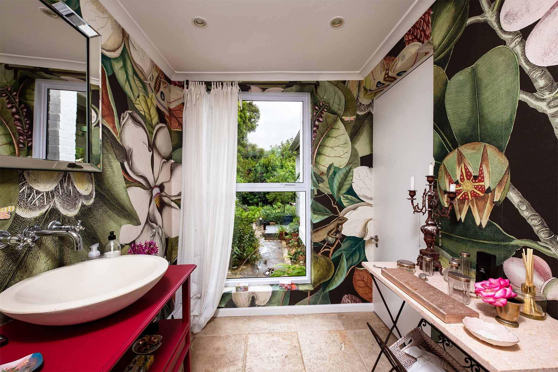 The bathroom features decorative wallpaper with bold, colorful floral patterns in shades of pink, green, and white. The distinctive wallpaper adds a vibrant backdrop behind the vanity and mirrors, easily highlighting its eye-catching design for search.