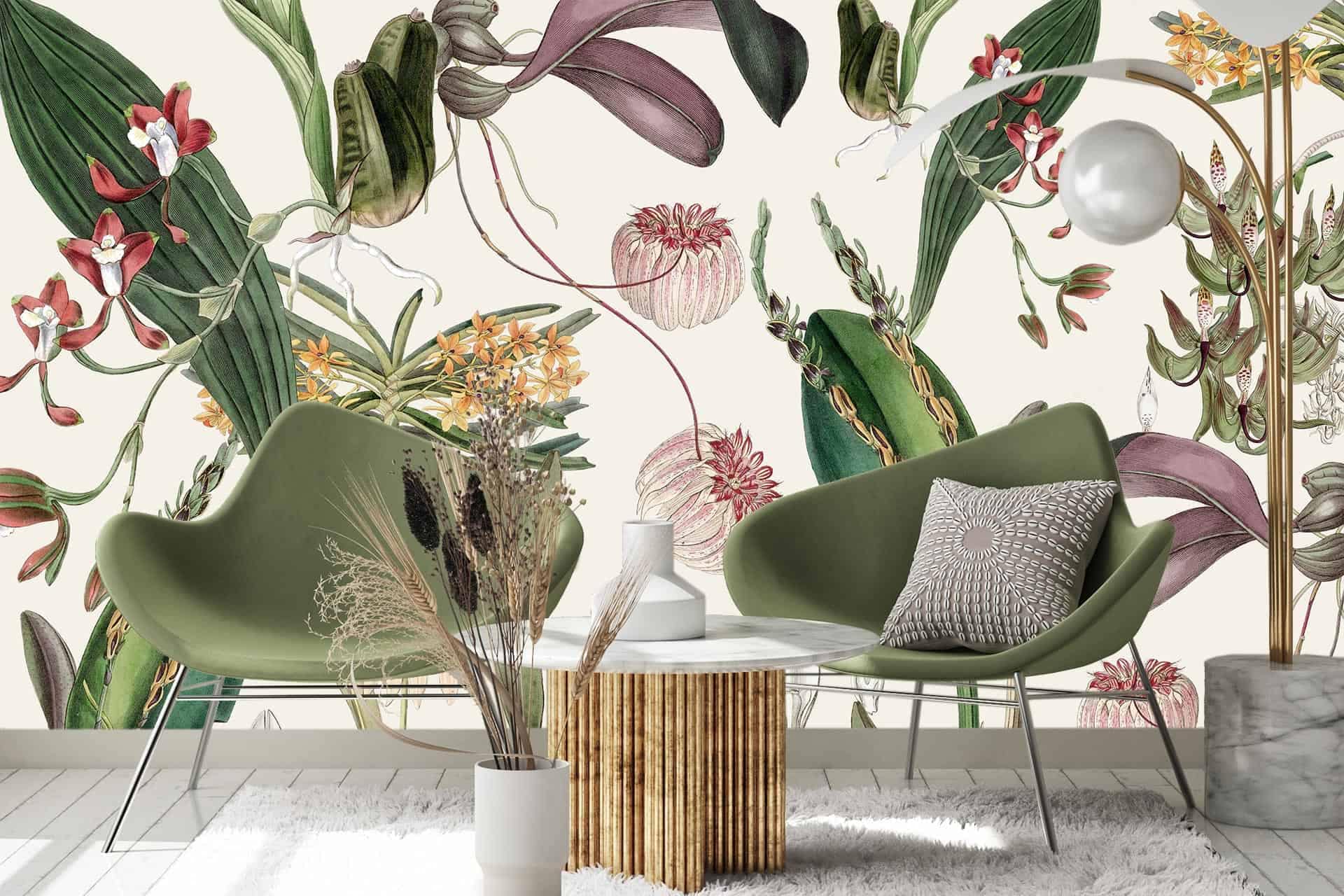 Vibrant floral and bird wallpaper featuring colorful flowers and birds in lively patterns, with bold hues of pink, green, blue, and yellow creating a dynamic focal point in the room.