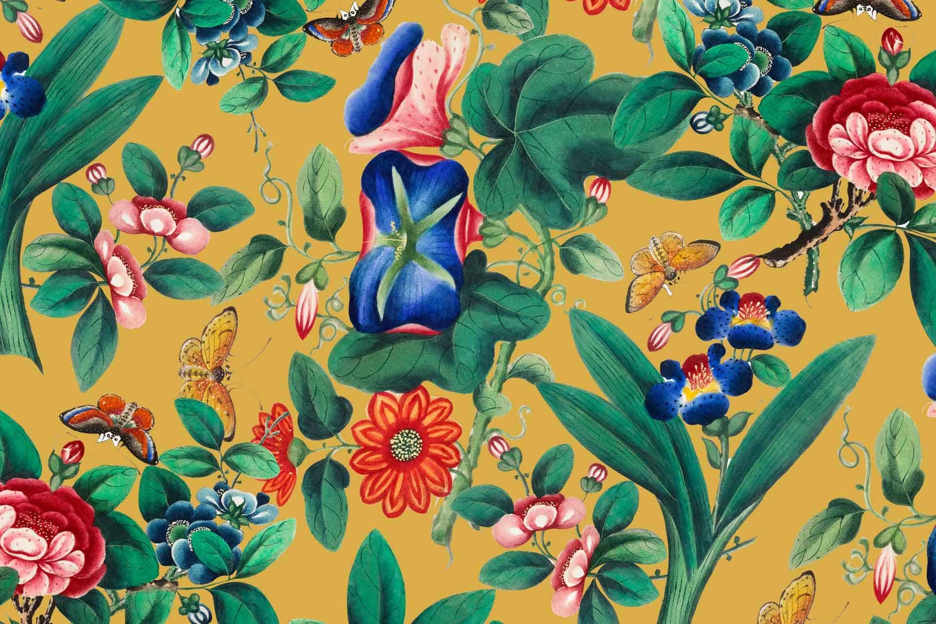 Vibrant floral and bird wallpaper featuring colorful flowers and birds in lively patterns, with bold hues of pink, green, blue, and yellow creating a dynamic focal point in the room.