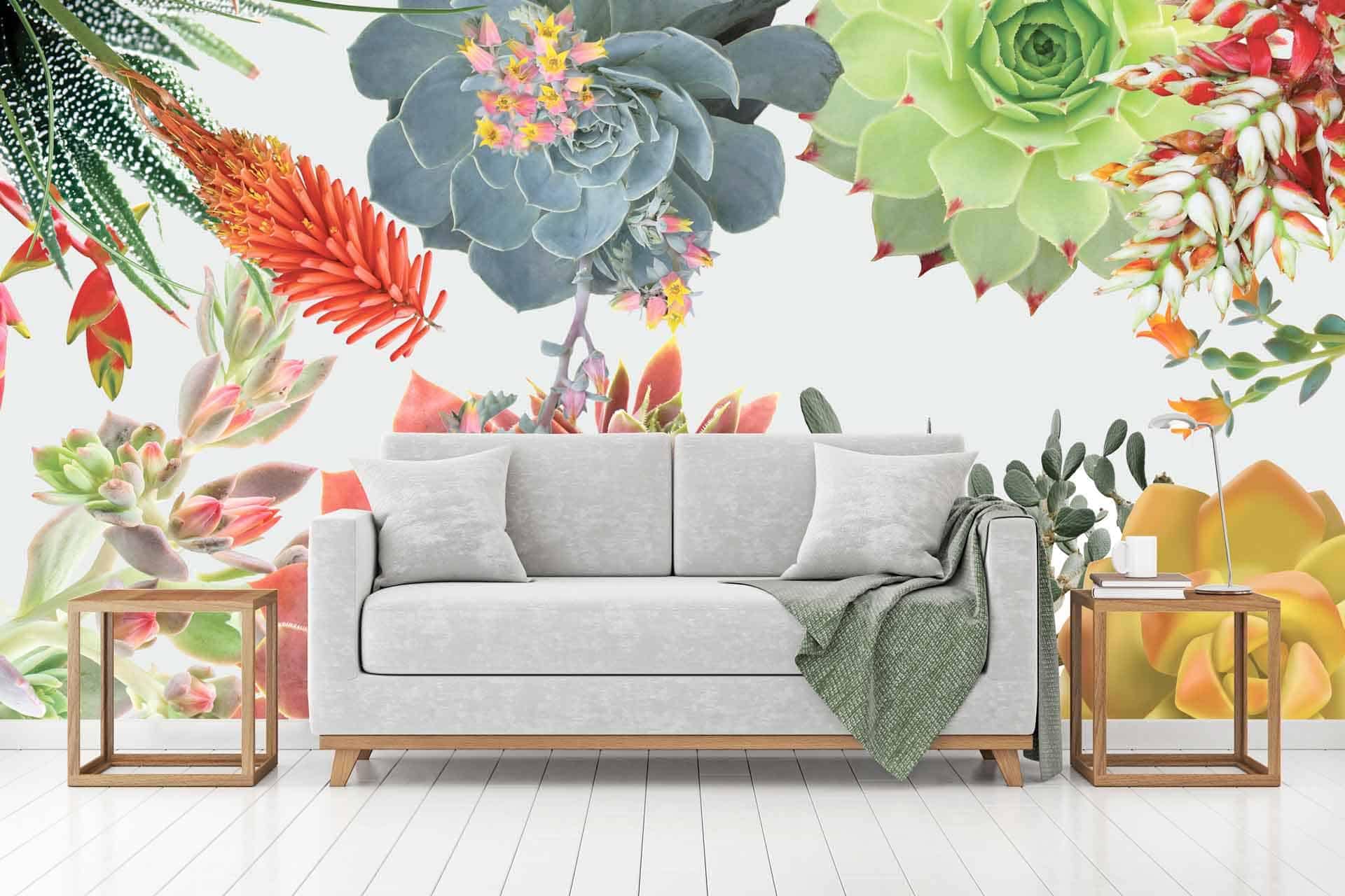 Vibrant floral and bird wallpaper featuring colorful flowers and birds in lively patterns, with bold hues of pink, green, blue, and yellow creating a dynamic focal point in the room.
