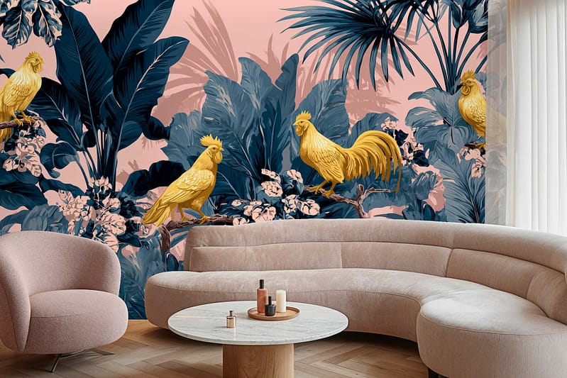 Vibrant floral and bird wallpaper featuring colorful flowers and birds in lively patterns, with bold hues of pink, green, blue, and yellow creating a dynamic focal point in the room.