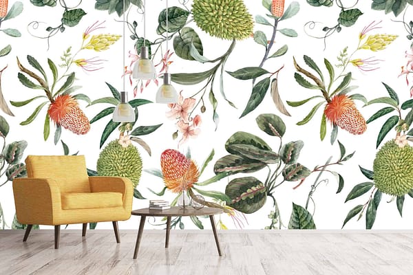 Vibrant floral and bird wallpaper featuring colorful flowers and birds in lively patterns, with bold hues of pink, green, blue, and yellow creating a dynamic focal point in the room.