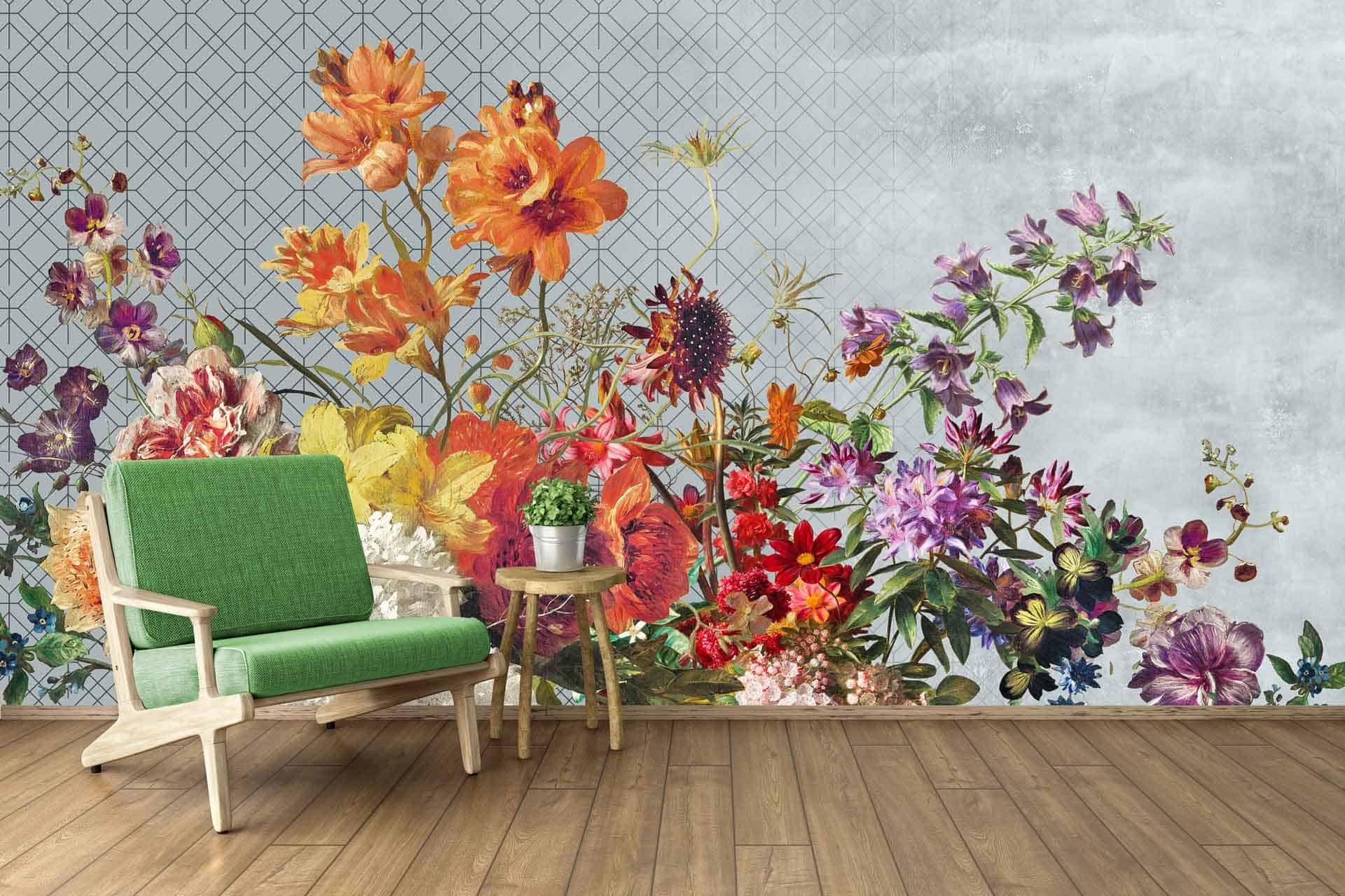 Vibrant floral and bird wallpaper featuring colorful flowers and birds in lively patterns, with bold hues of pink, green, blue, and yellow creating a dynamic focal point in the room.