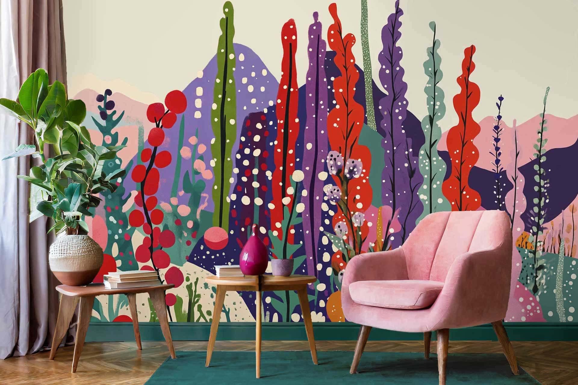 Vibrant floral and bird wallpaper featuring colorful flowers and birds in lively patterns, with bold hues of pink, green, blue, and yellow creating a dynamic focal point in the room.