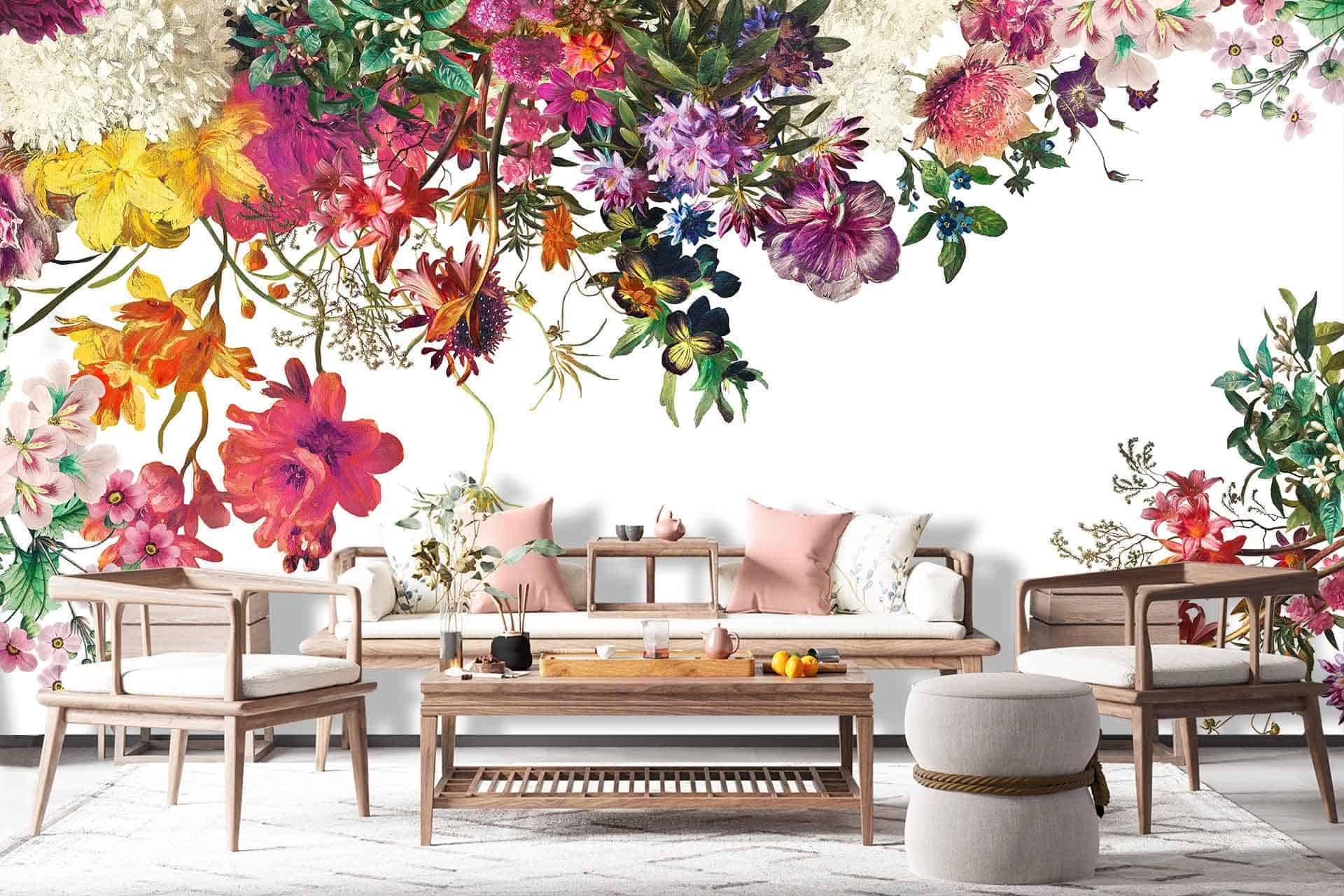 Vibrant floral and bird wallpaper featuring colorful flowers and birds in lively patterns, with bold hues of pink, green, blue, and yellow creating a dynamic focal point in the room.