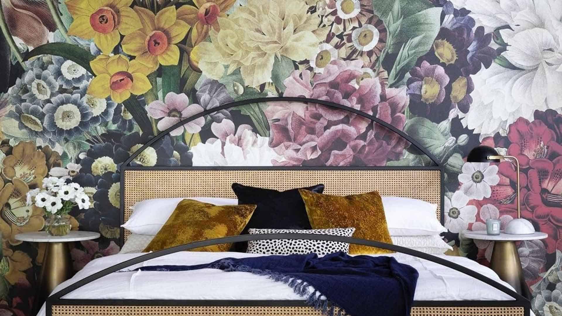 Vibrant floral and bird wallpaper featuring colorful flowers and birds in lively patterns, with bold hues of pink, green, blue, and yellow creating a dynamic focal point in the room.
