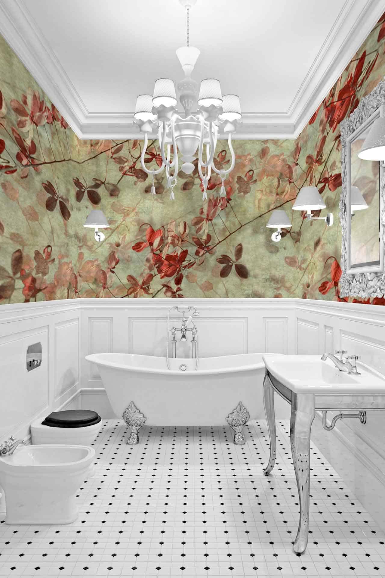 The bathroom features decorative wallpaper with bold, colorful floral patterns in shades of pink, green, and white. The distinctive wallpaper adds a vibrant backdrop behind the vanity and mirrors, easily highlighting its eye-catching design for search.