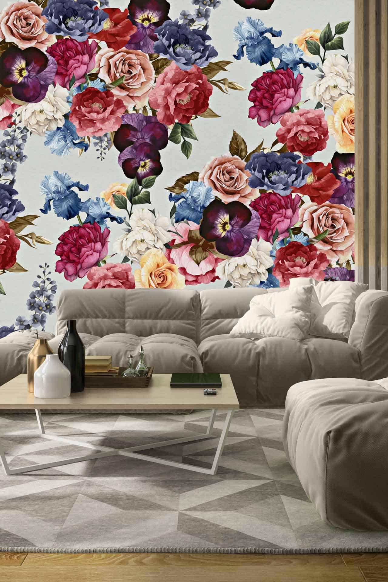 Vibrant floral and bird wallpaper featuring colorful flowers and birds in lively patterns, with bold hues of pink, green, blue, and yellow creating a dynamic focal point in the room.