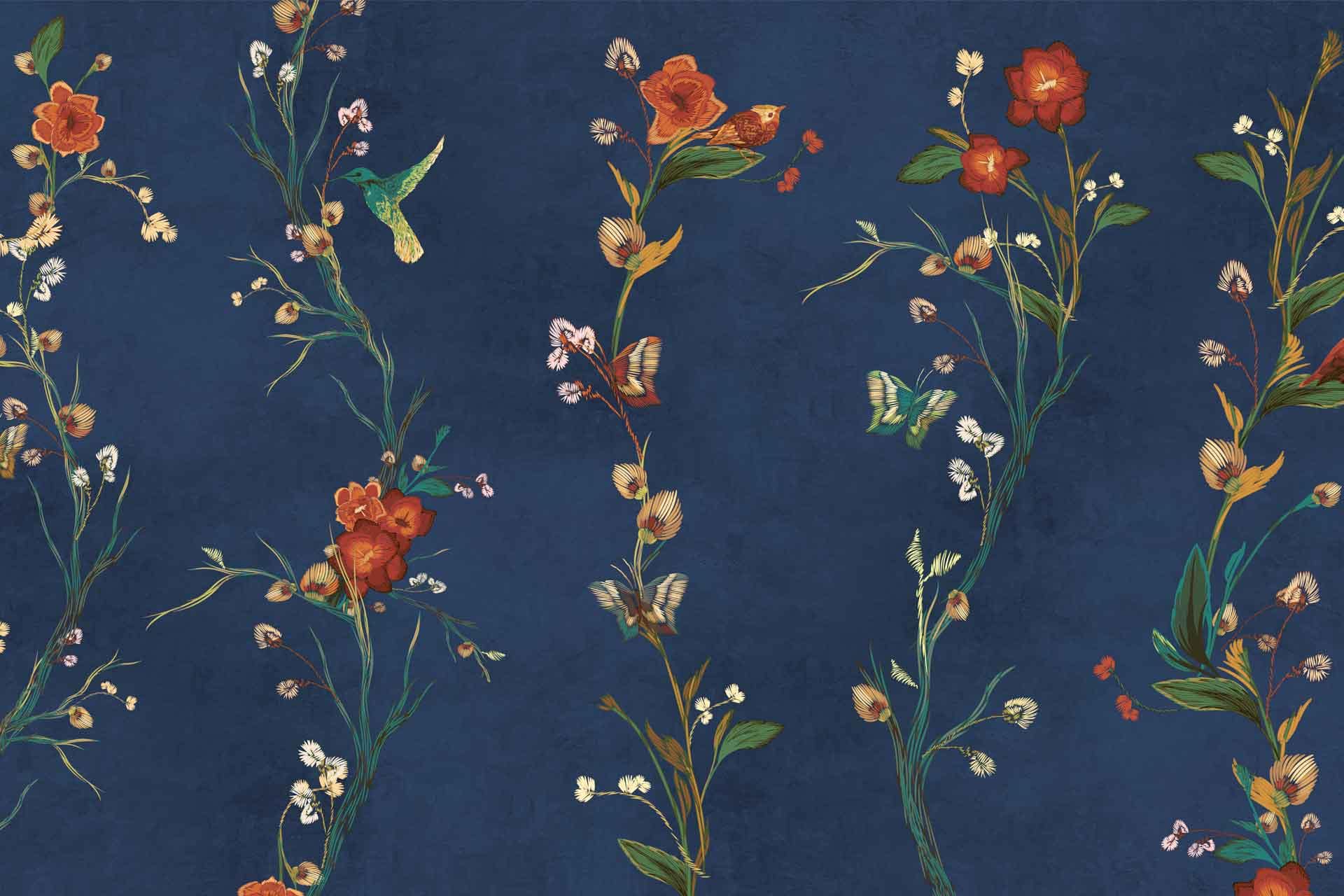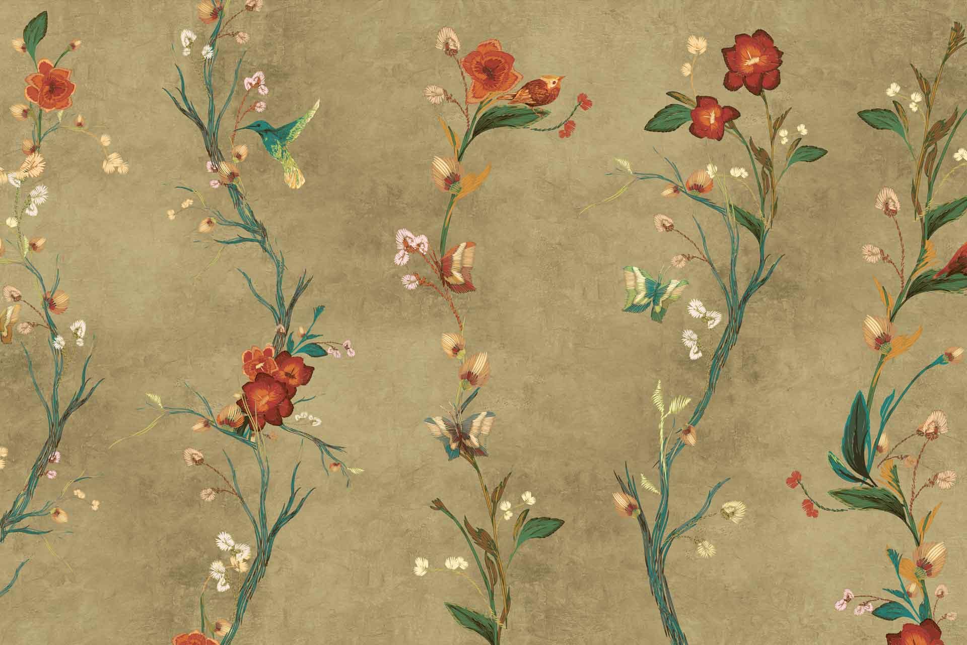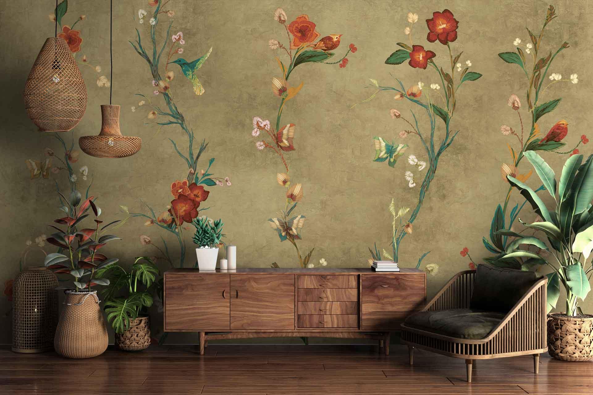 Vibrant floral and bird wallpaper featuring colorful flowers and birds in lively patterns, with bold hues of pink, green, blue, and yellow creating a dynamic focal point in the room.