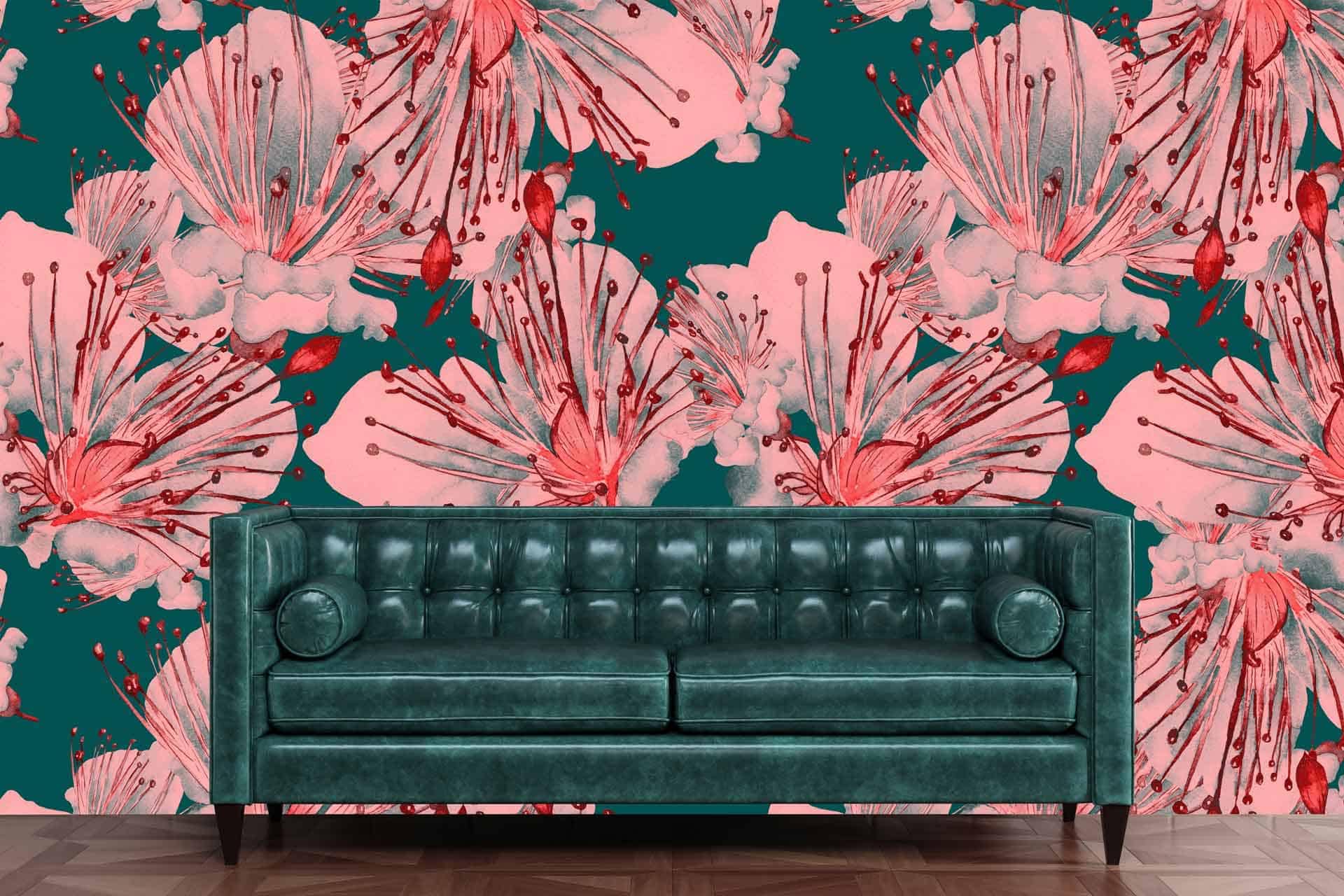 Vibrant floral and bird wallpaper featuring colorful flowers and birds in lively patterns, with bold hues of pink, green, blue, and yellow creating a dynamic focal point in the room.