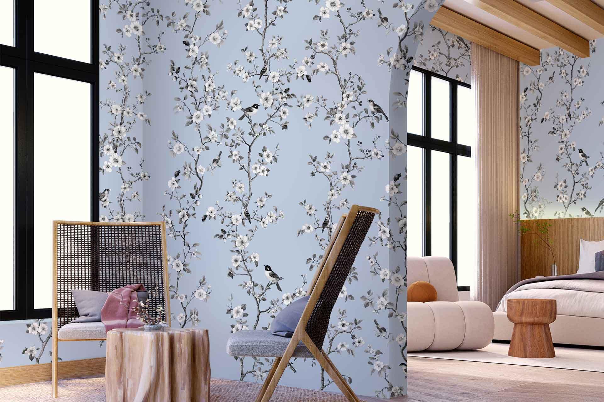 Vibrant floral and bird wallpaper featuring colorful flowers and birds in lively patterns, with bold hues of pink, green, blue, and yellow creating a dynamic focal point in the room.