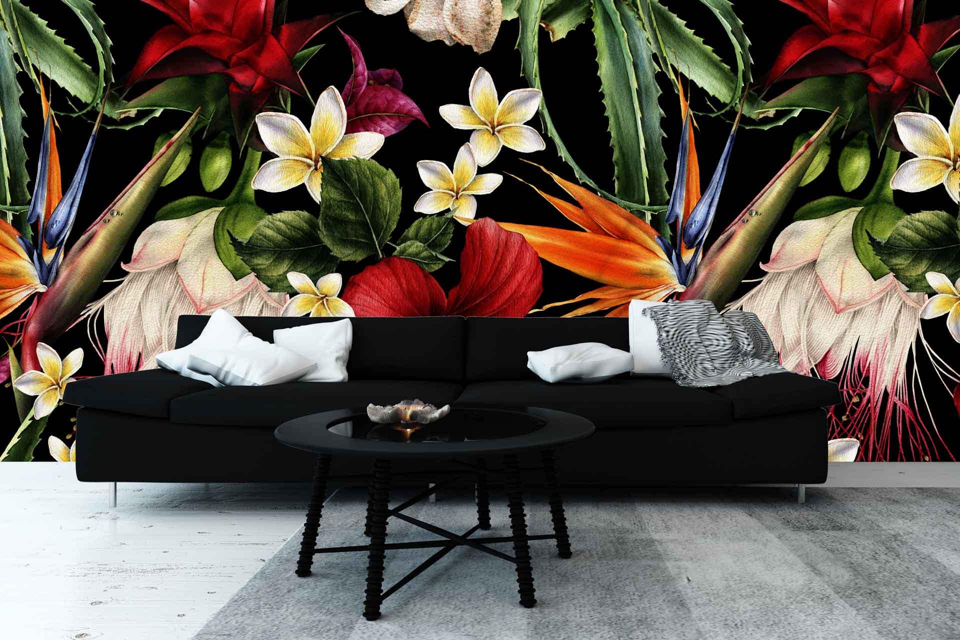 Vibrant floral and bird wallpaper featuring colorful flowers and birds in lively patterns, with bold hues of pink, green, blue, and yellow creating a dynamic focal point in the room.