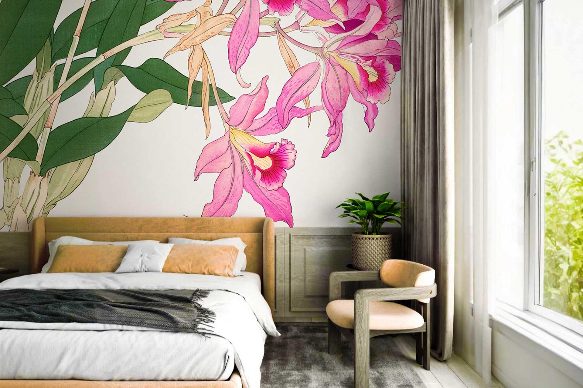 Vibrant floral and bird wallpaper featuring colorful flowers and birds in lively patterns, with bold hues of pink, green, blue, and yellow creating a dynamic focal point in the room.