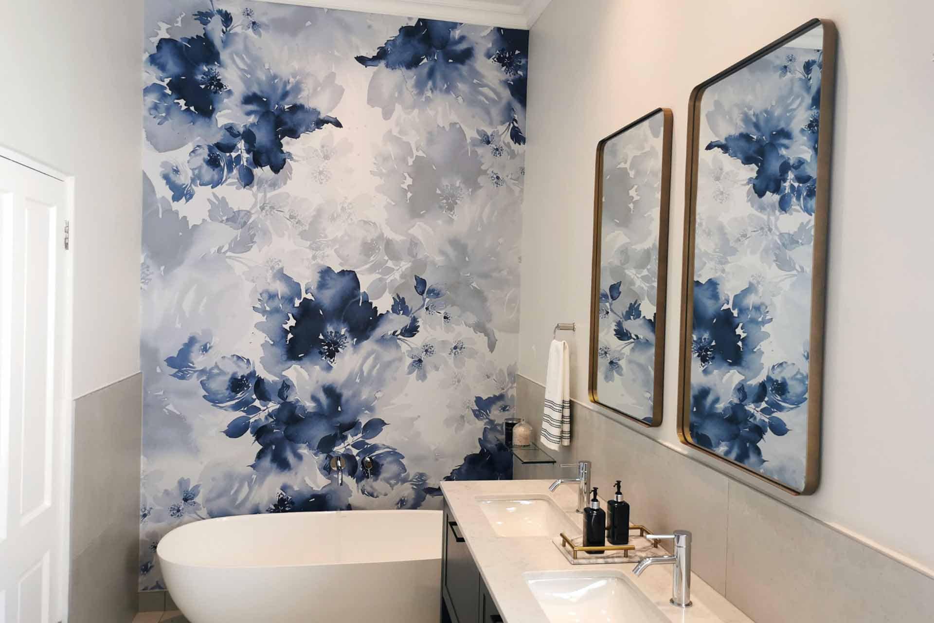 The bathroom features decorative wallpaper with bold, colorful floral patterns in shades of pink, green, and white. The distinctive wallpaper adds a vibrant backdrop behind the vanity and mirrors, easily highlighting its eye-catching design for search.