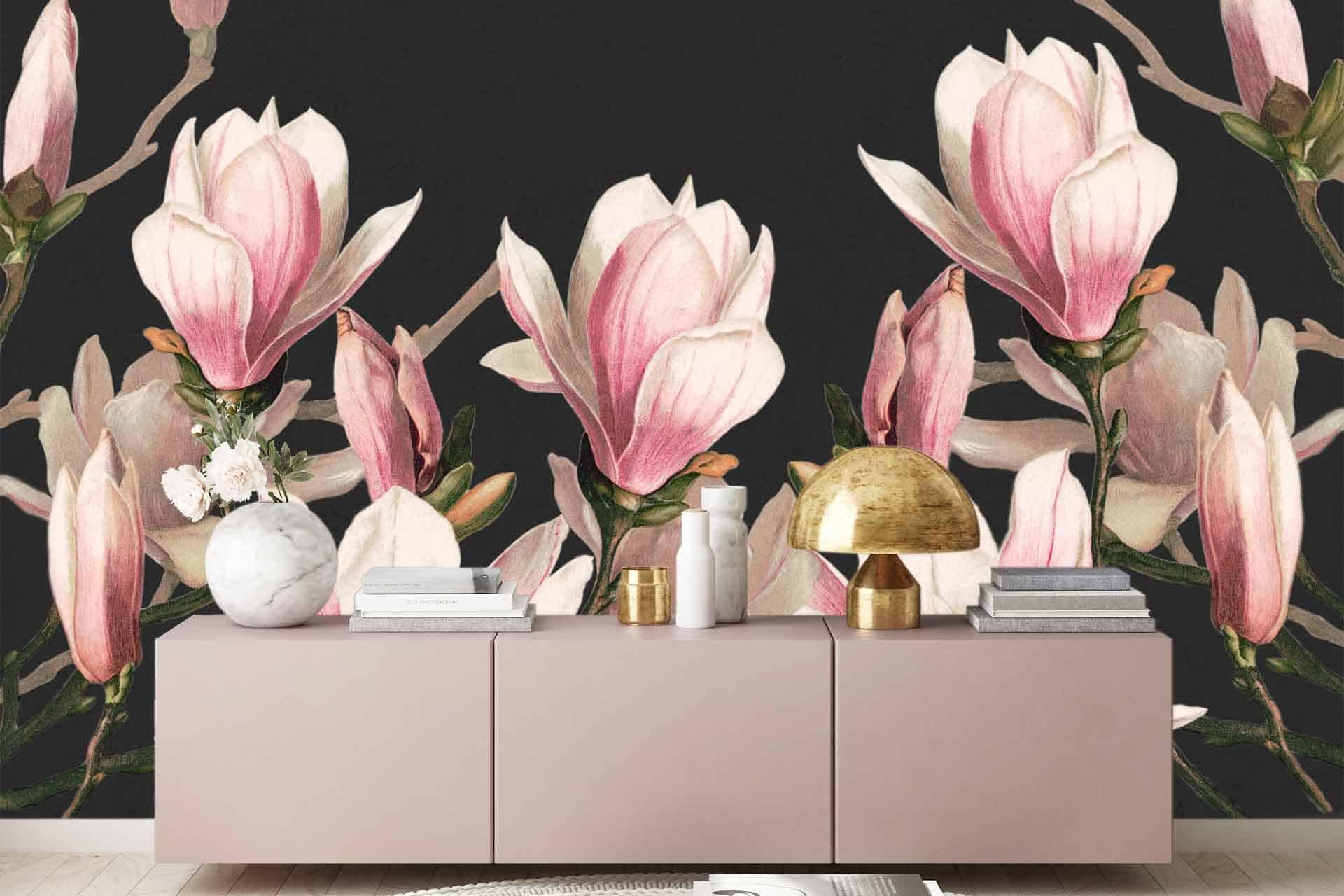 The bathroom features decorative wallpaper with bold, colorful floral patterns in shades of pink, green, and white. The distinctive wallpaper adds a vibrant backdrop behind the vanity and mirrors, easily highlighting its eye-catching design for search.