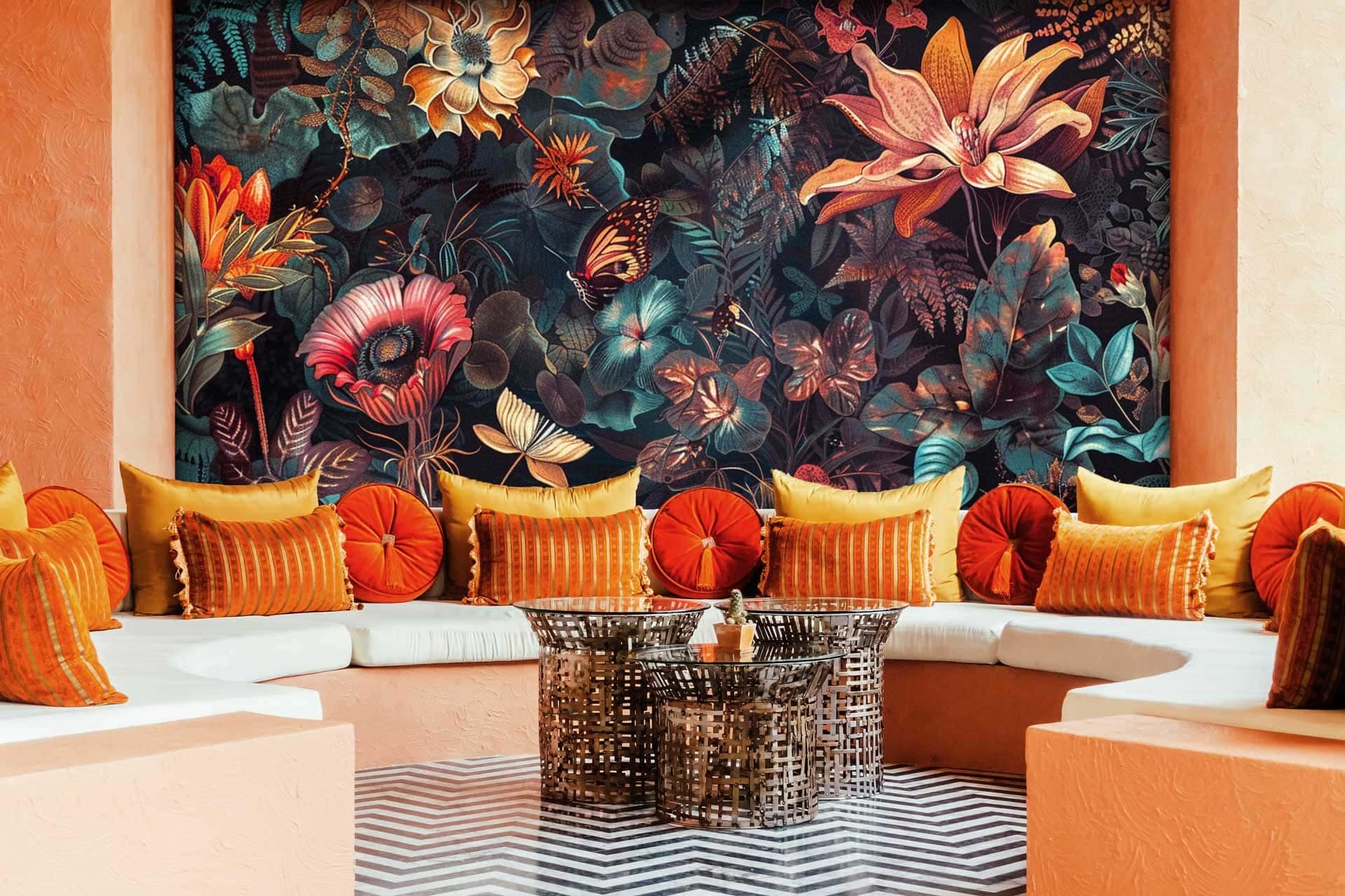 Vibrant floral and bird wallpaper featuring colorful flowers and birds in lively patterns, with bold hues of pink, green, blue, and yellow creating a dynamic focal point in the room.