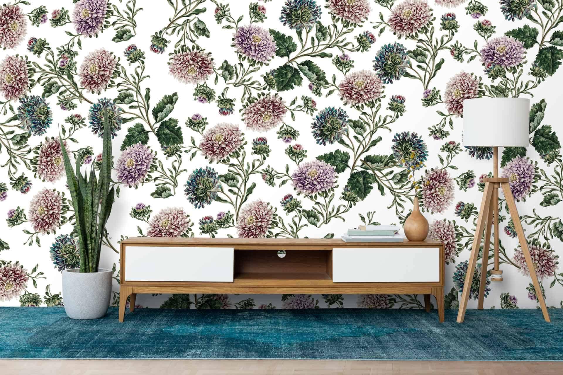 Vibrant floral and bird wallpaper featuring colorful flowers and birds in lively patterns, with bold hues of pink, green, blue, and yellow creating a dynamic focal point in the room.