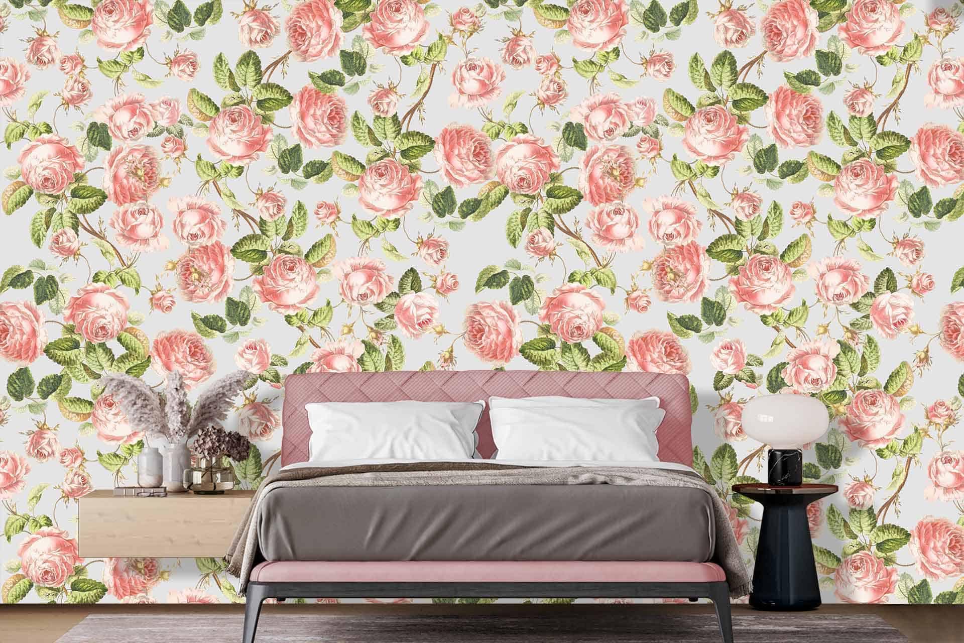 The bathroom features decorative wallpaper with bold, colorful floral patterns in shades of pink, green, and white. The distinctive wallpaper adds a vibrant backdrop behind the vanity and mirrors, easily highlighting its eye-catching design for search.