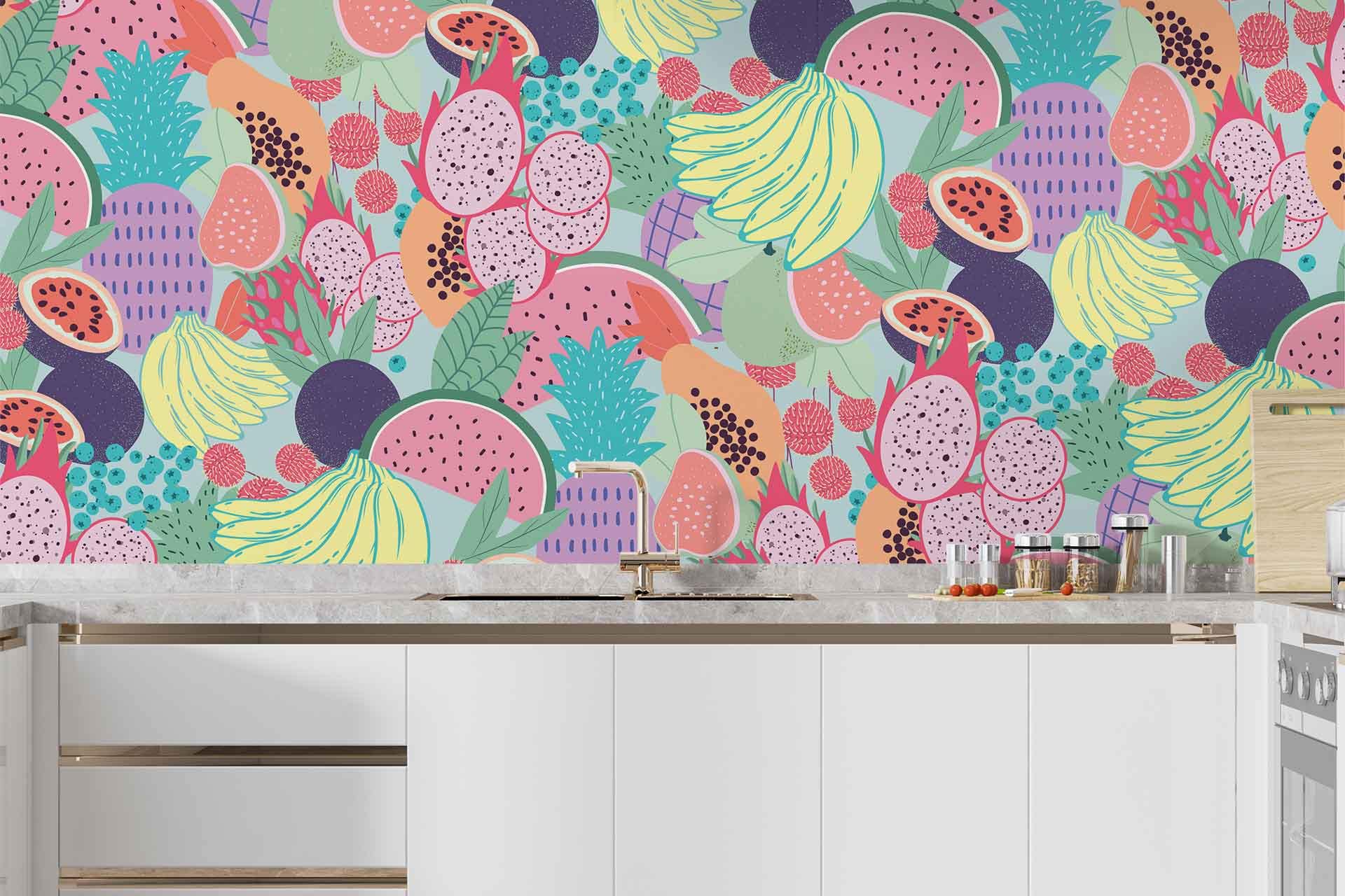 Vibrant floral and bird wallpaper featuring colorful flowers and birds in lively patterns, with bold hues of pink, green, blue, and yellow creating a dynamic focal point in the room.