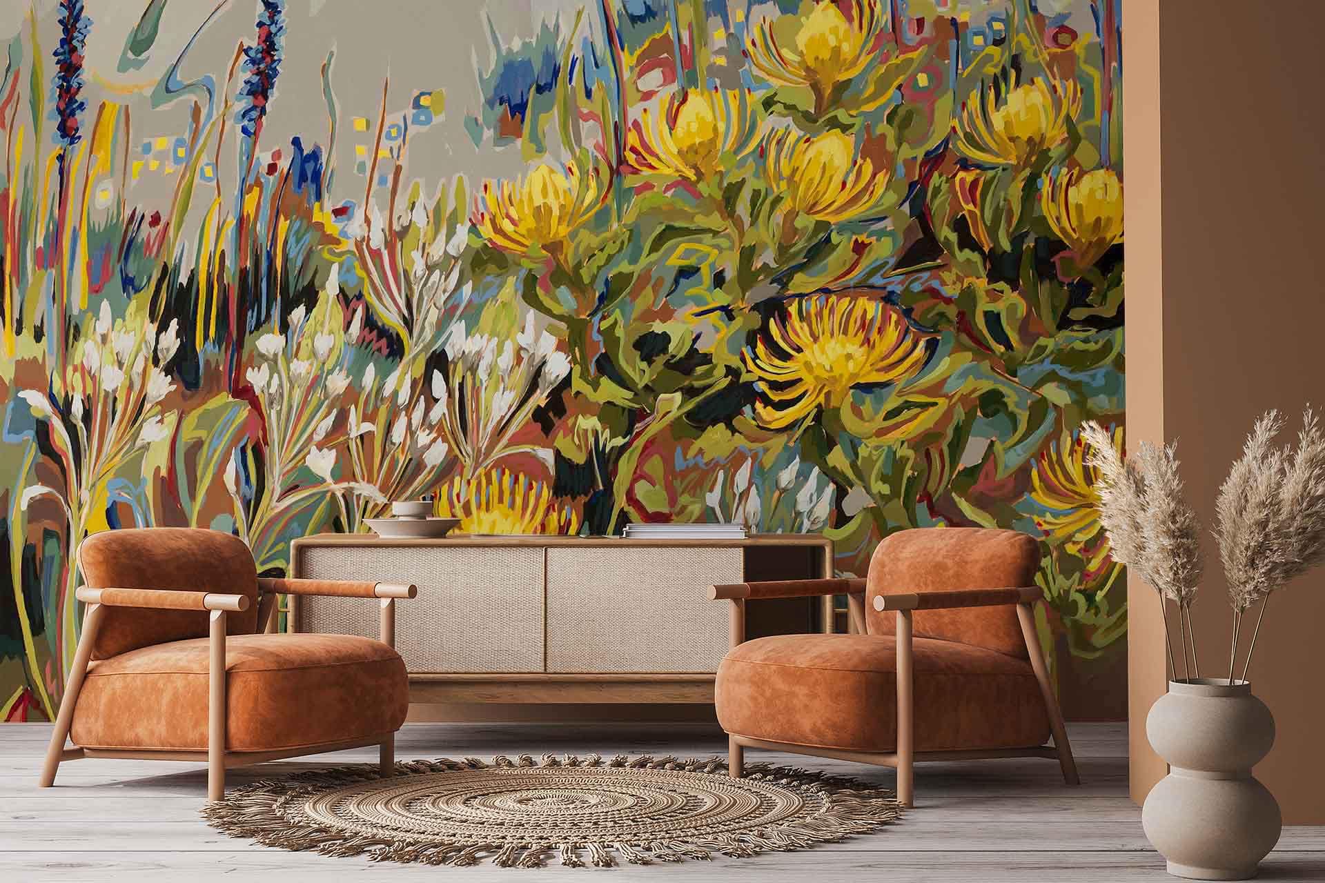 2024 Pincushions, Chinkerinchees and Aristeas – Amplify series is a wallpaper design that forms part of our CS&Co collection. It is by the artist Hermien van der Merwe. As with all our designs, it will be redesigned to suit your wall size and shape.