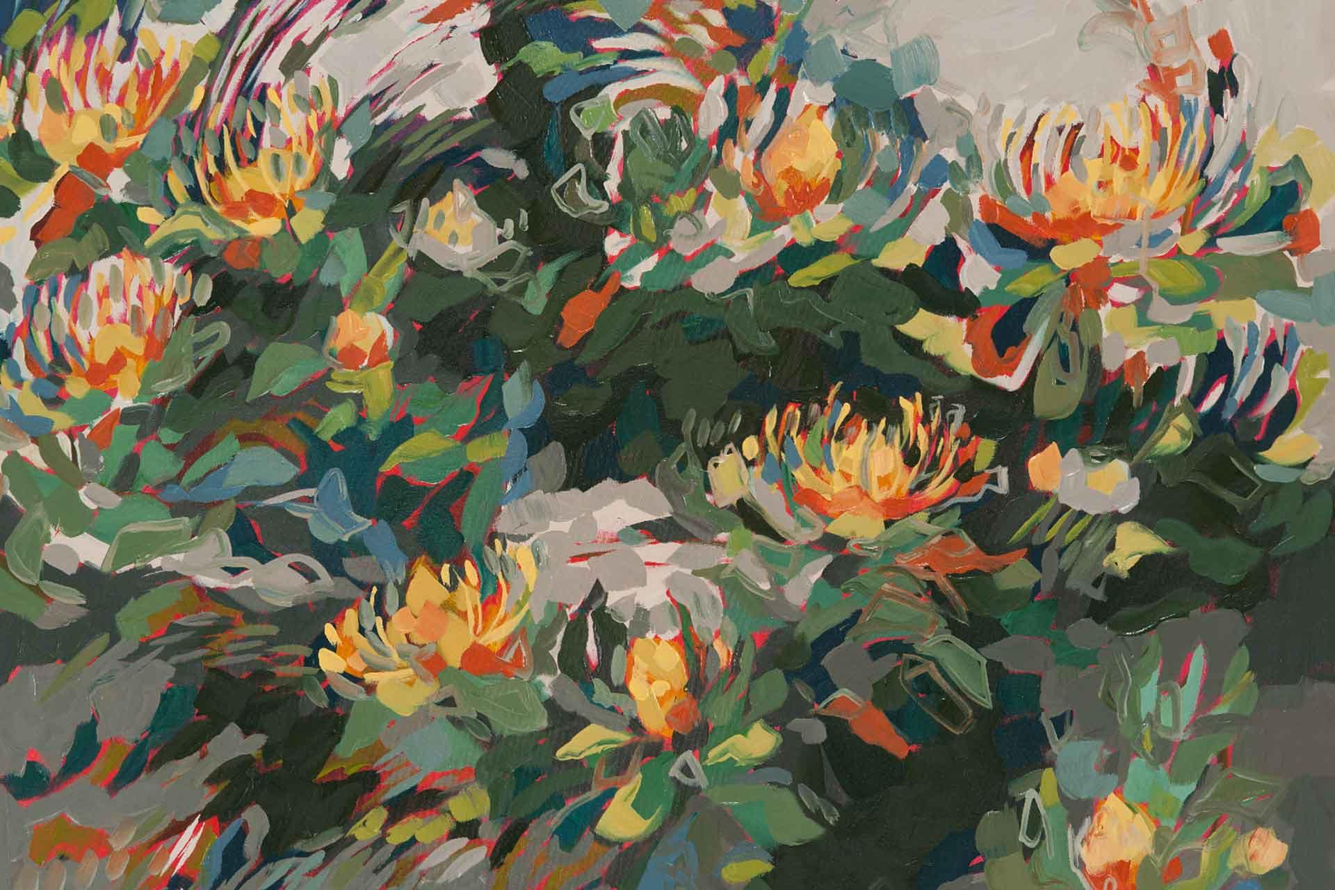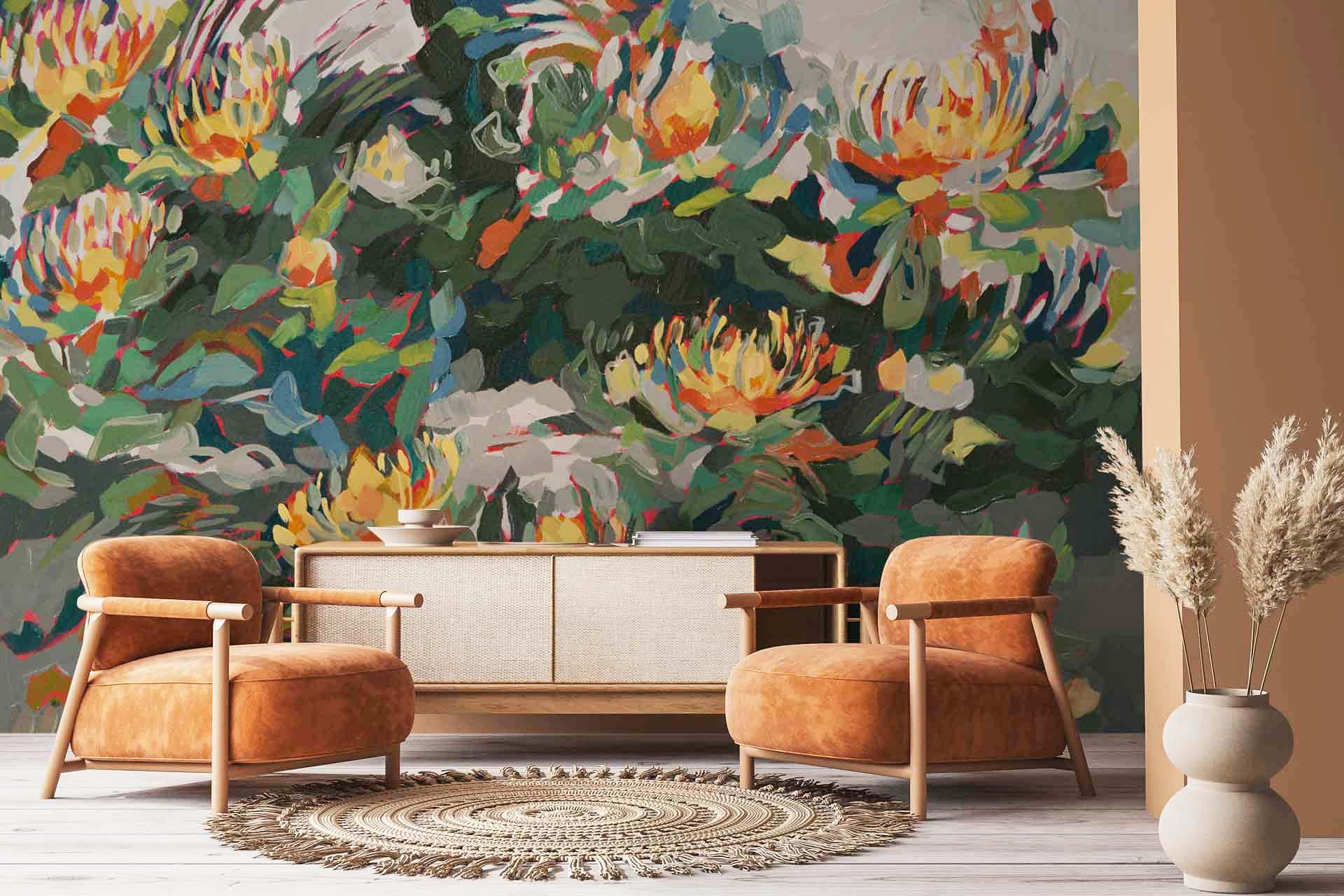 Abstract Pincushion Proteas – Response Series is a wallpaper design that forms part of our CS&Co collection. It is by the artist Hermien van der Merwe. As with all our designs, it will be redesigned to suit your wall size and shape.