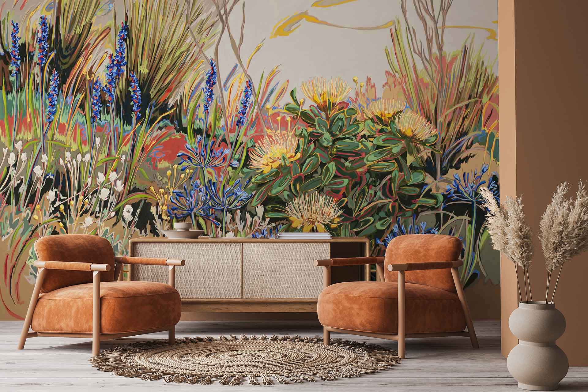 FL Protea Nitida, Agapanthus, Atistea and Everlastings – Amplify series is a wallpaper design that forms part of our CS&Co collection. It is by the artist Hermien van der Merwe. As with all our designs, it will be redesigned to suit your wall size and shape.