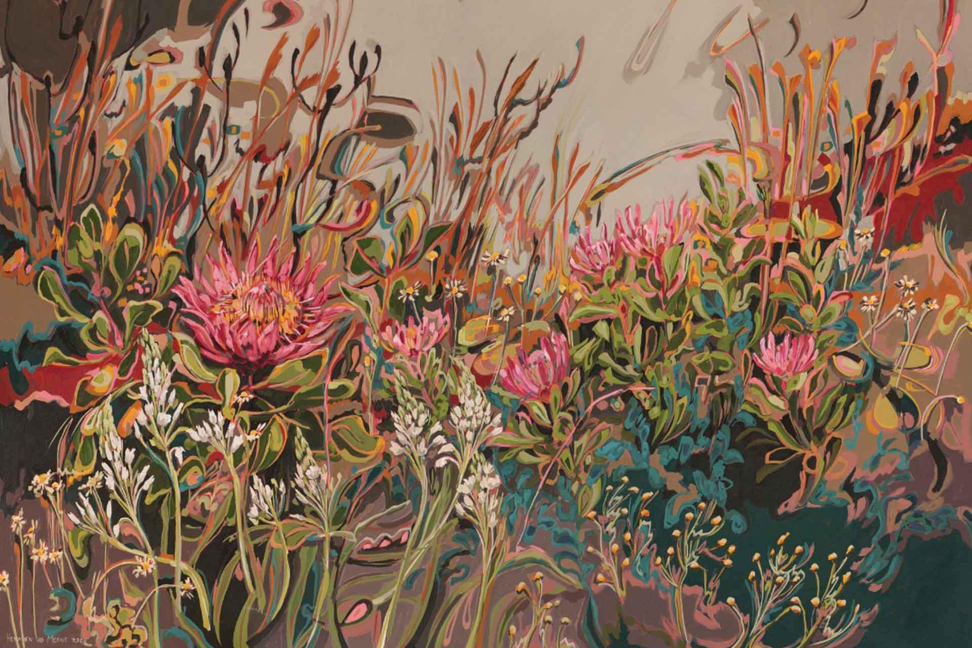Fynbos Landscape with King Protea, Chinkerinchee and Sugarbush is a wallpaper design that forms part of our CS&Co collection. It is by the artist Hermien van der Merwe. As with all our designs, it will be redesigned to suit your wall size and shape.