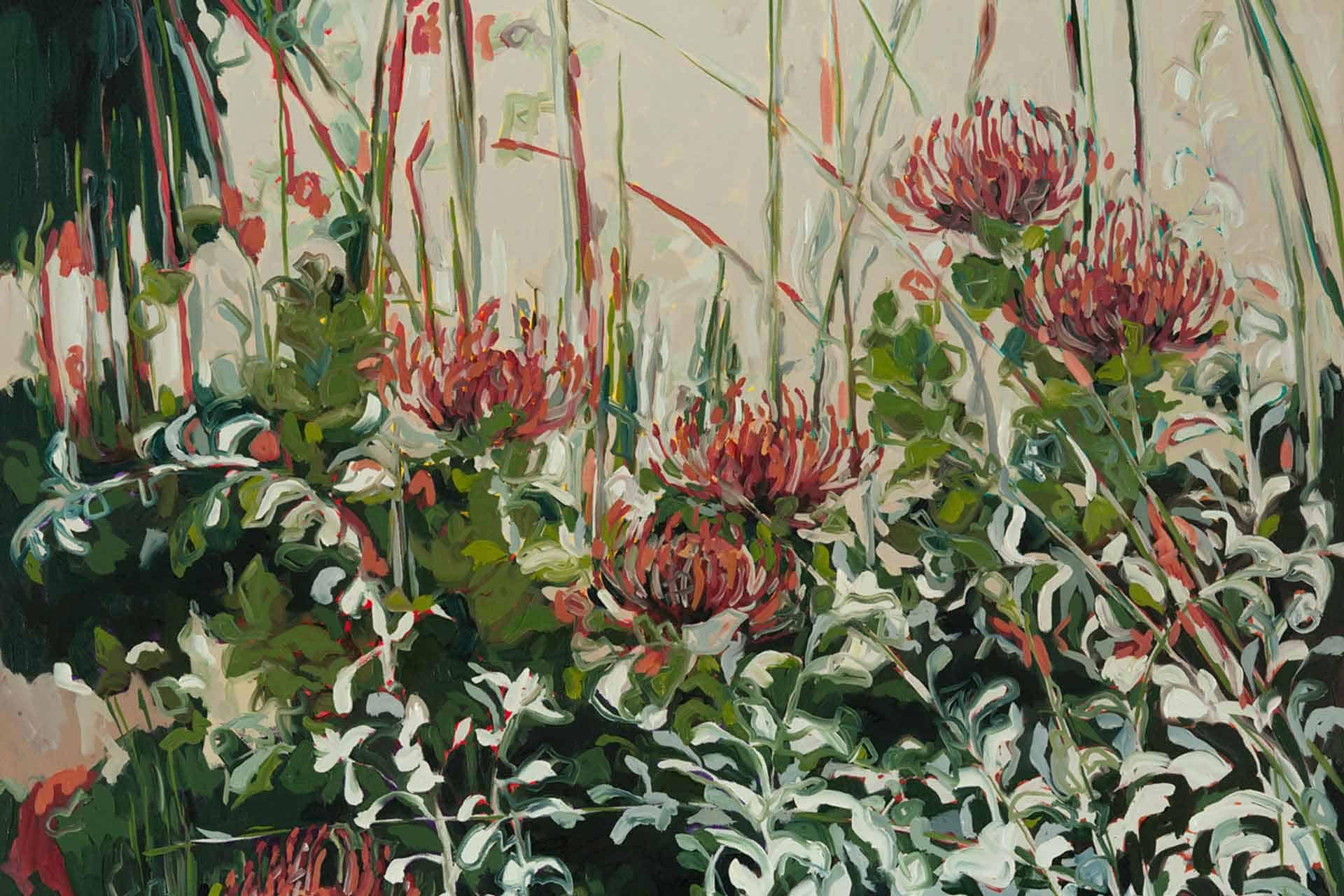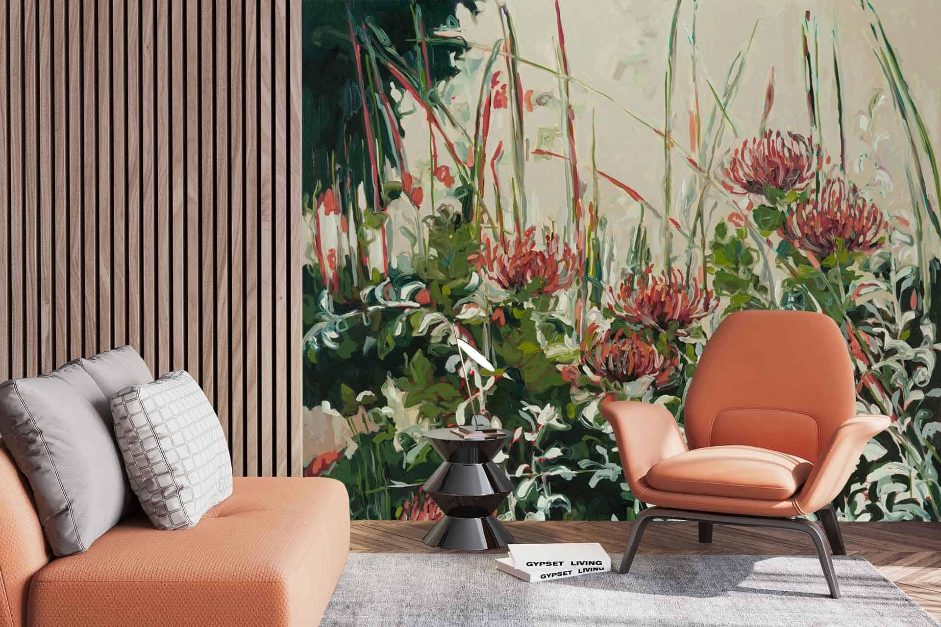 Protea Leucospermum Flames is a wallpaper design that forms part of our CS&Co collection. It is by the artist Hermien van der Merwe. As with all our designs, it will be redesigned to suit your wall size and shape.