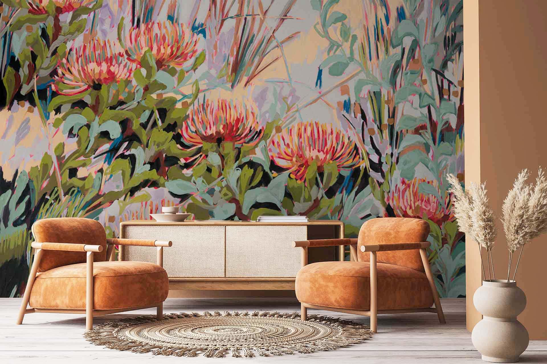 Vibrant floral and bird wallpaper featuring colorful flowers and birds in lively patterns, with bold hues of pink, green, blue, and yellow creating a dynamic focal point in the room.