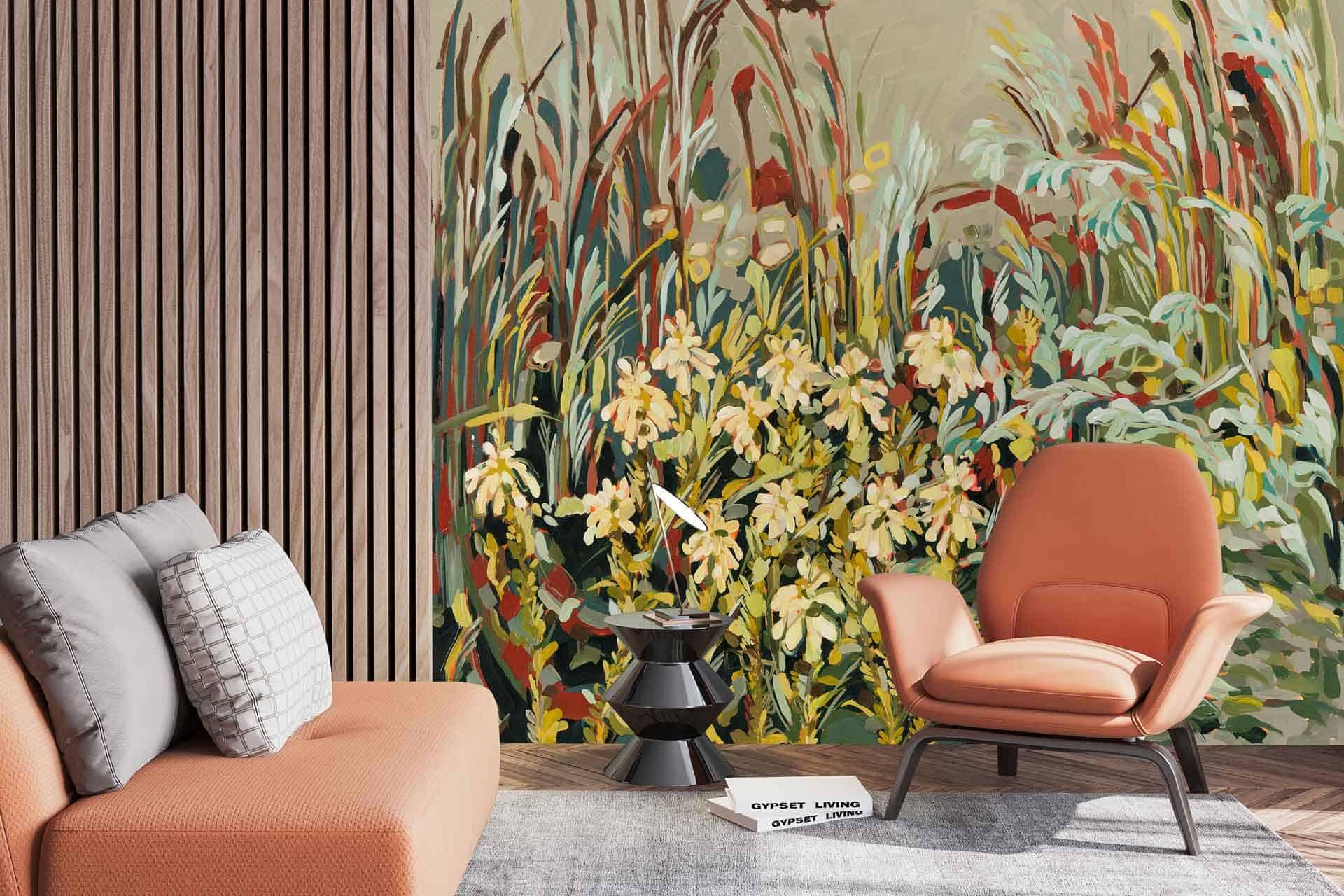 Vibrant floral and bird wallpaper featuring colorful flowers and birds in lively patterns, with bold hues of pink, green, blue, and yellow creating a dynamic focal point in the room.