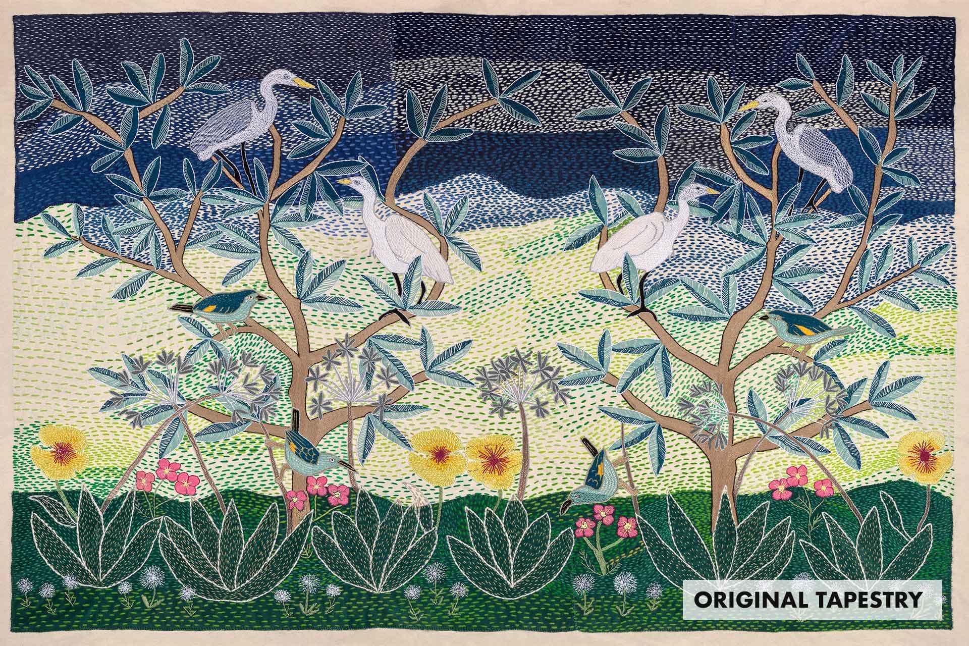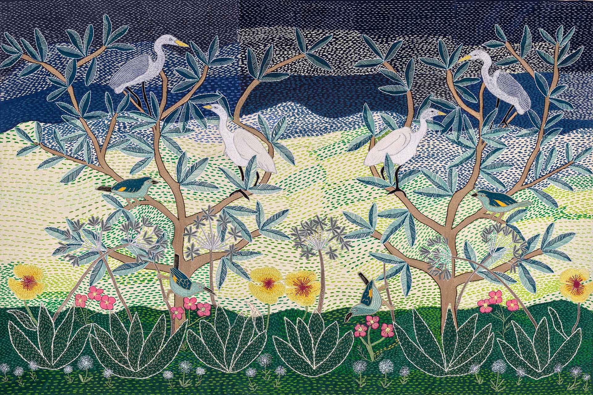 Stitched, A Story of Our Home is a unique South African scenic wallpaper sharing the embroidery artwork of The Kieskamma Arts Trust, created in collaboration with Clout/SA. As with all of our designs we are able to scale the visual to all wall sizes.