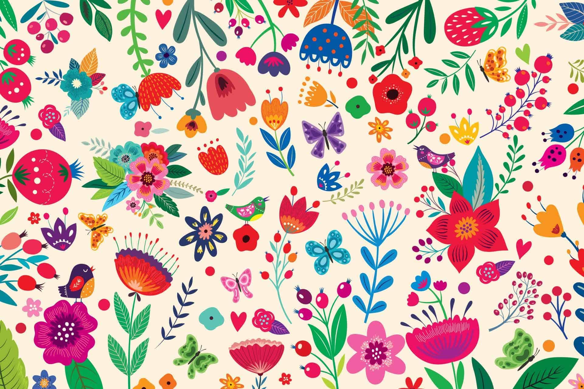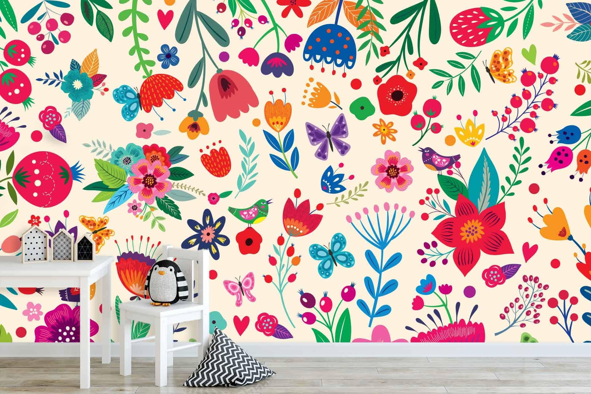 Vibrant floral and bird wallpaper featuring colorful flowers and birds in lively patterns, with bold hues of pink, green, blue, and yellow creating a dynamic focal point in the room.