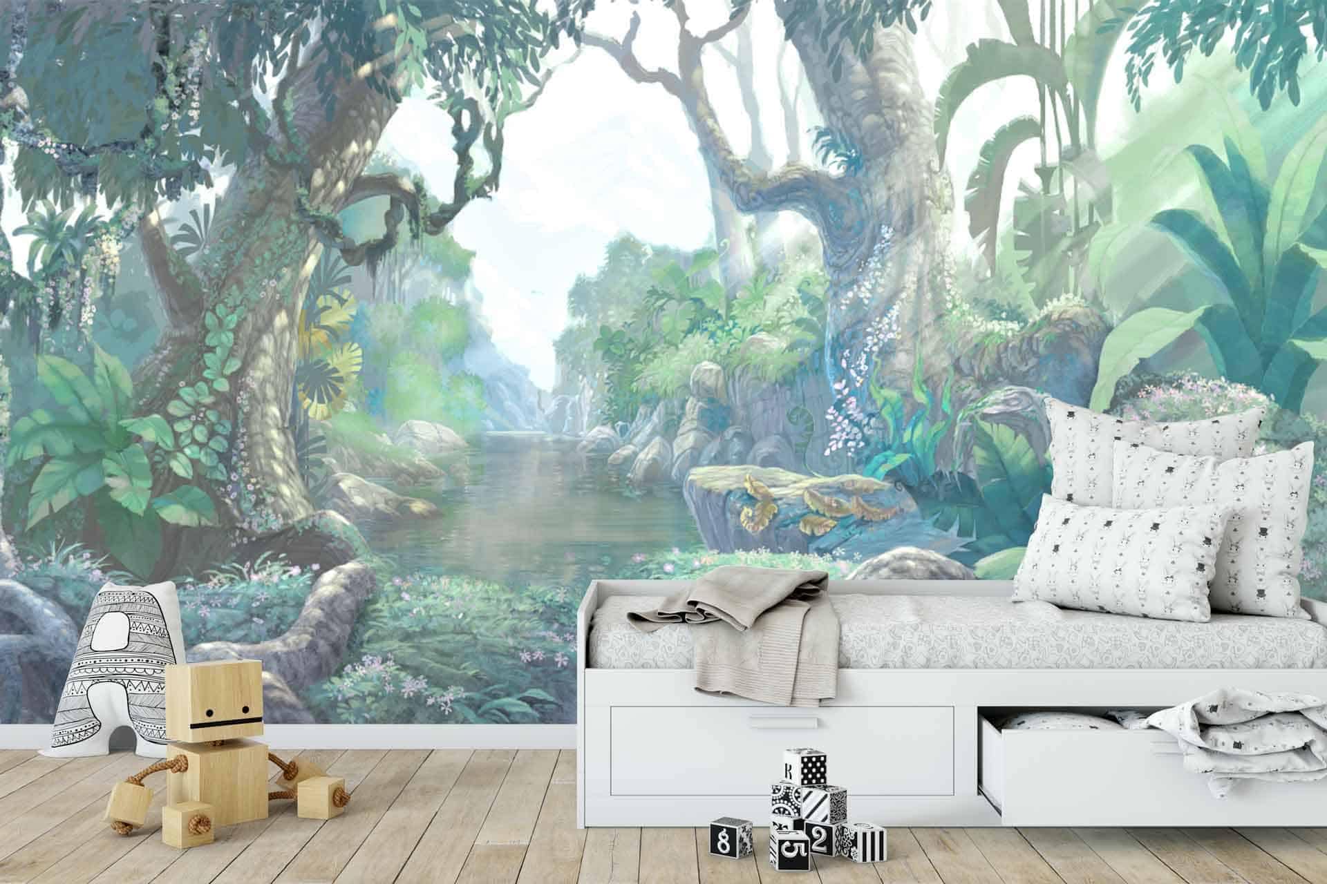 Vibrant floral and bird wallpaper featuring colorful flowers and birds in lively patterns, with bold hues of pink, green, blue, and yellow creating a dynamic focal point in the room.