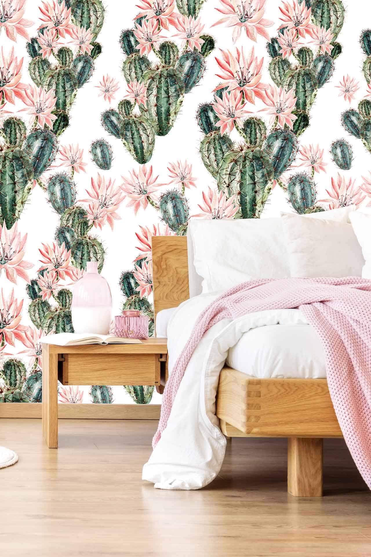 Vibrant floral and bird wallpaper featuring colorful flowers and birds in lively patterns, with bold hues of pink, green, blue, and yellow creating a dynamic focal point in the room.