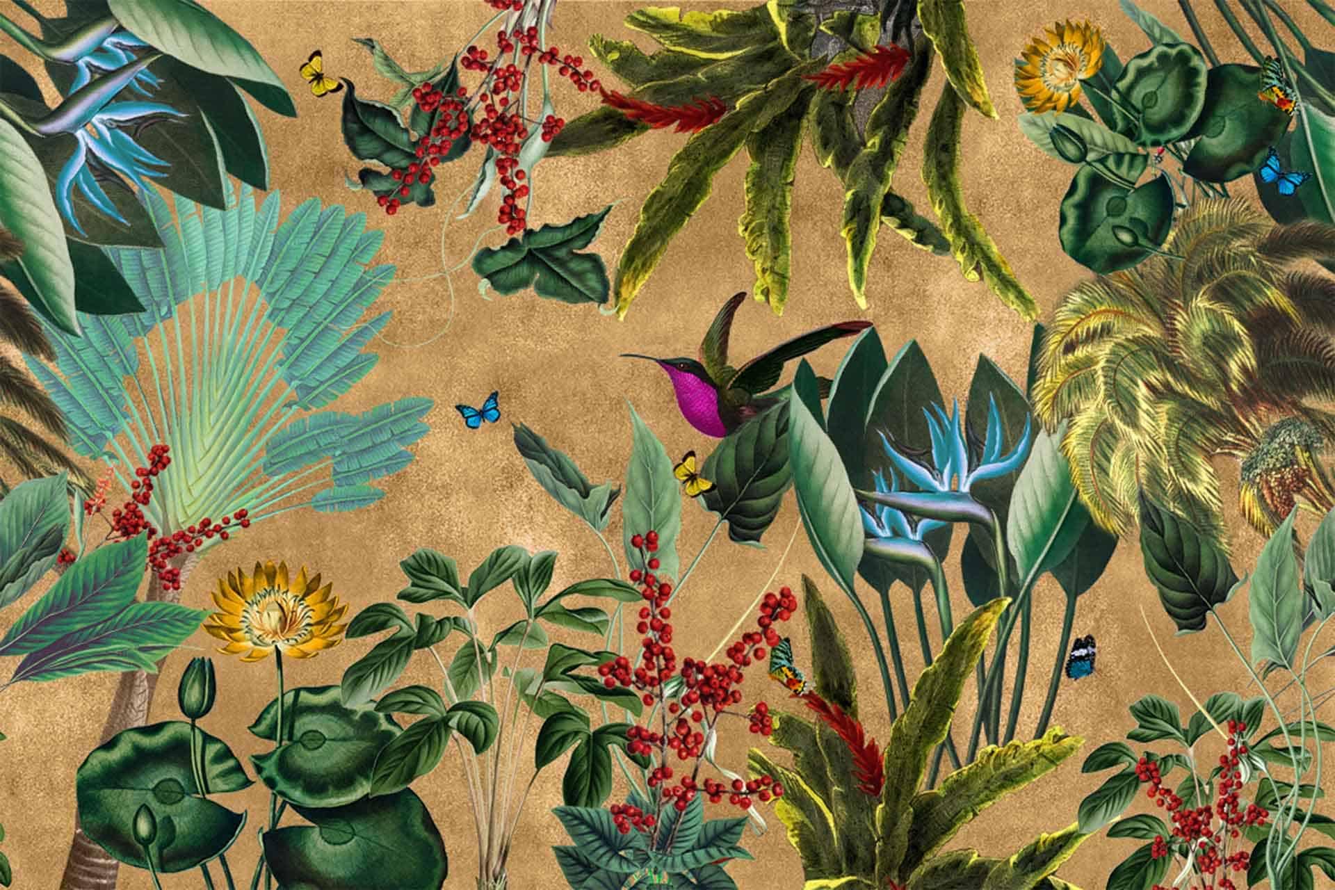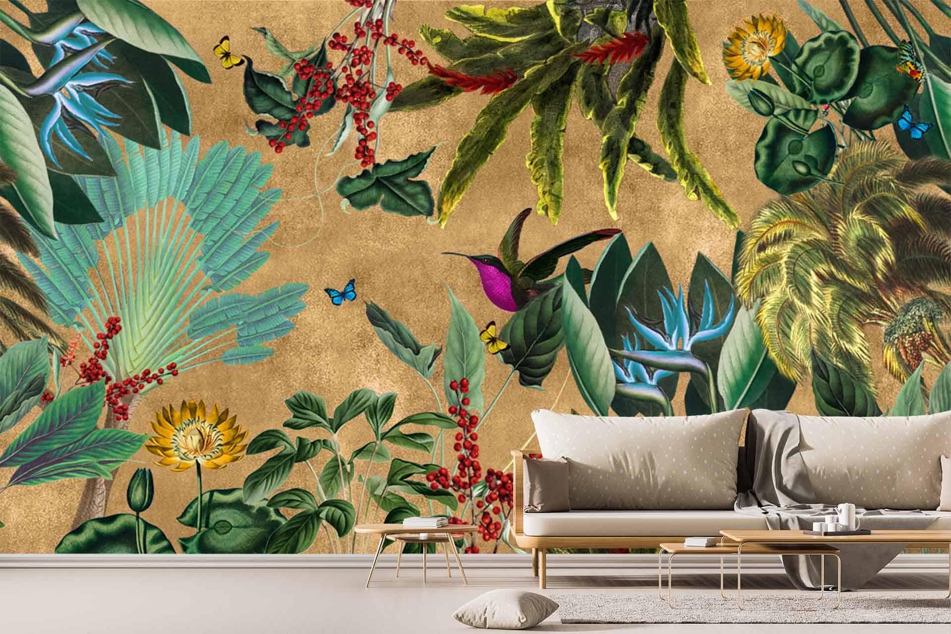Vibrant floral and bird wallpaper featuring colorful flowers and birds in lively patterns, with bold hues of pink, green, blue, and yellow creating a dynamic focal point in the room.