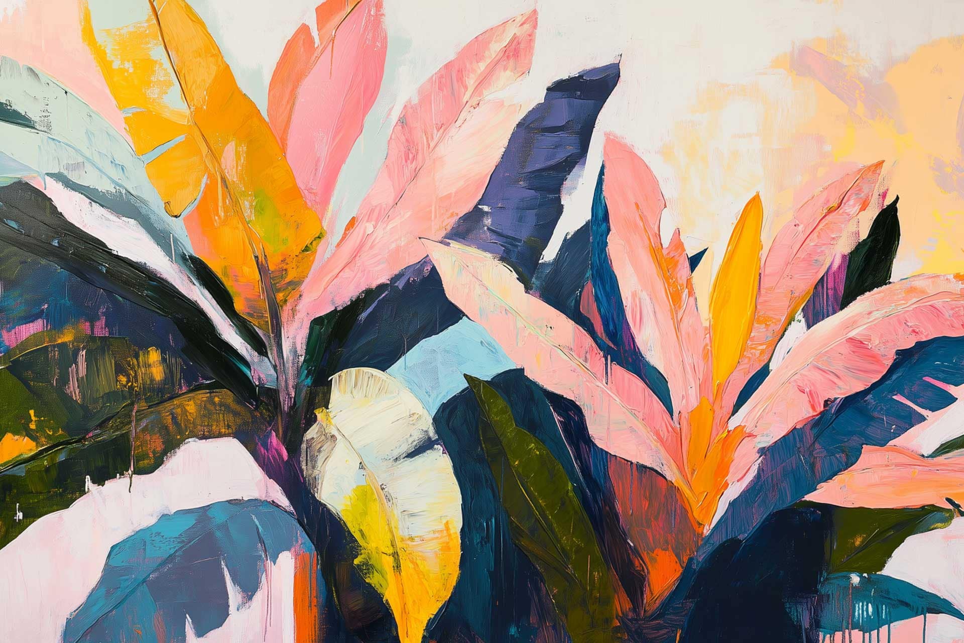 Vibrant floral and bird wallpaper featuring colorful flowers and birds in lively patterns, with bold hues of pink, green, blue, and yellow creating a dynamic focal point in the room.